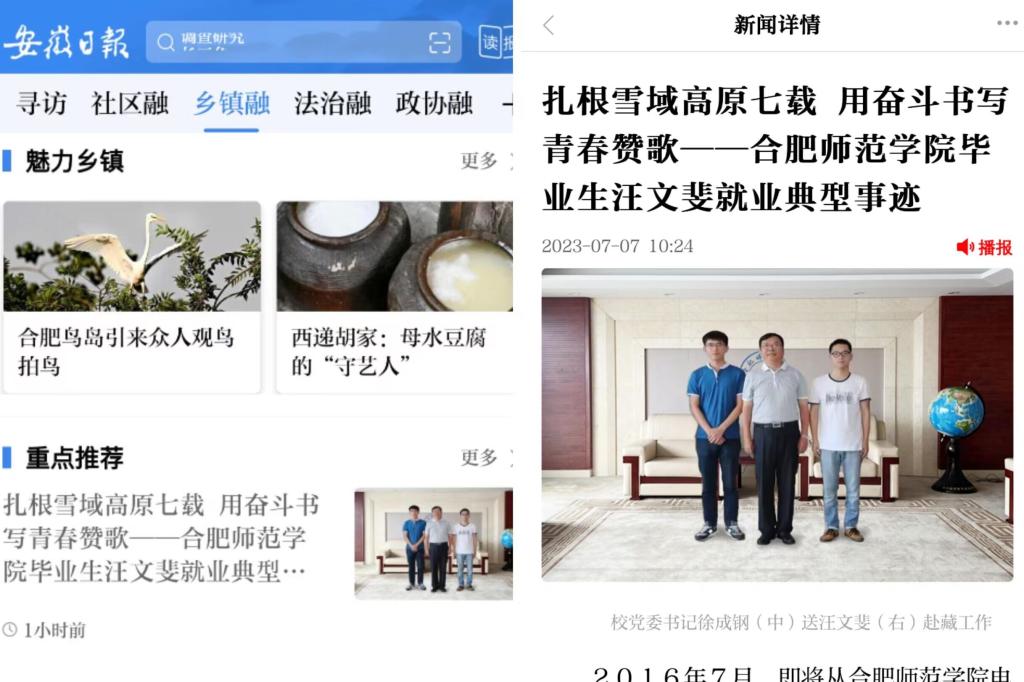 7月7日,安徽日报以《扎根雪域高原七载 用奋斗书写青春赞歌——beat365中文官方网站毕业生汪文斐就业典型事迹》为题,对此进行了报道。