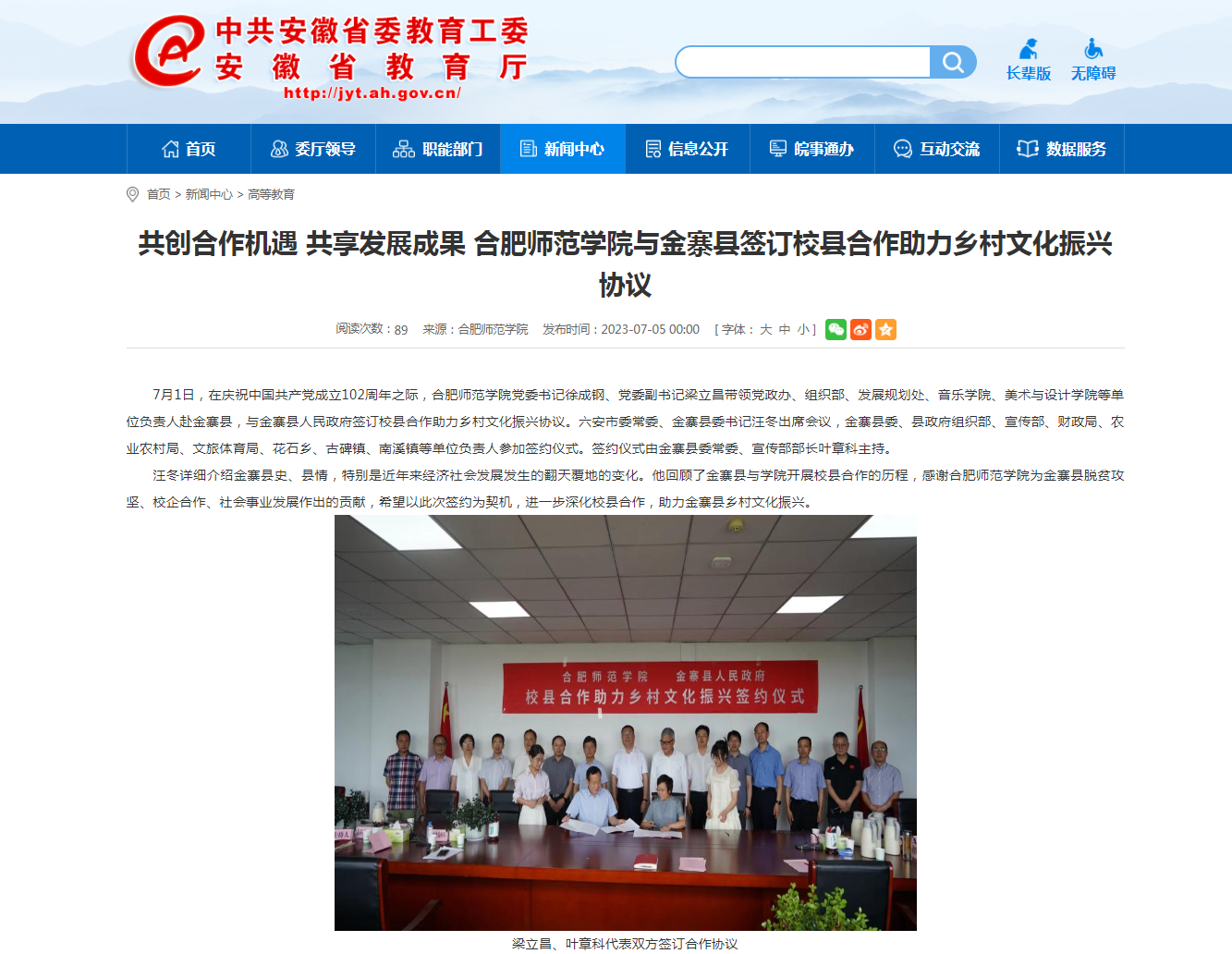 7月5日,安徽教育网首页以《共创合作机遇 共享发展成果 beat365中文官方网站与金寨县签订校县合作助力乡村文化振兴协议》为标题,对此进行了报道。
