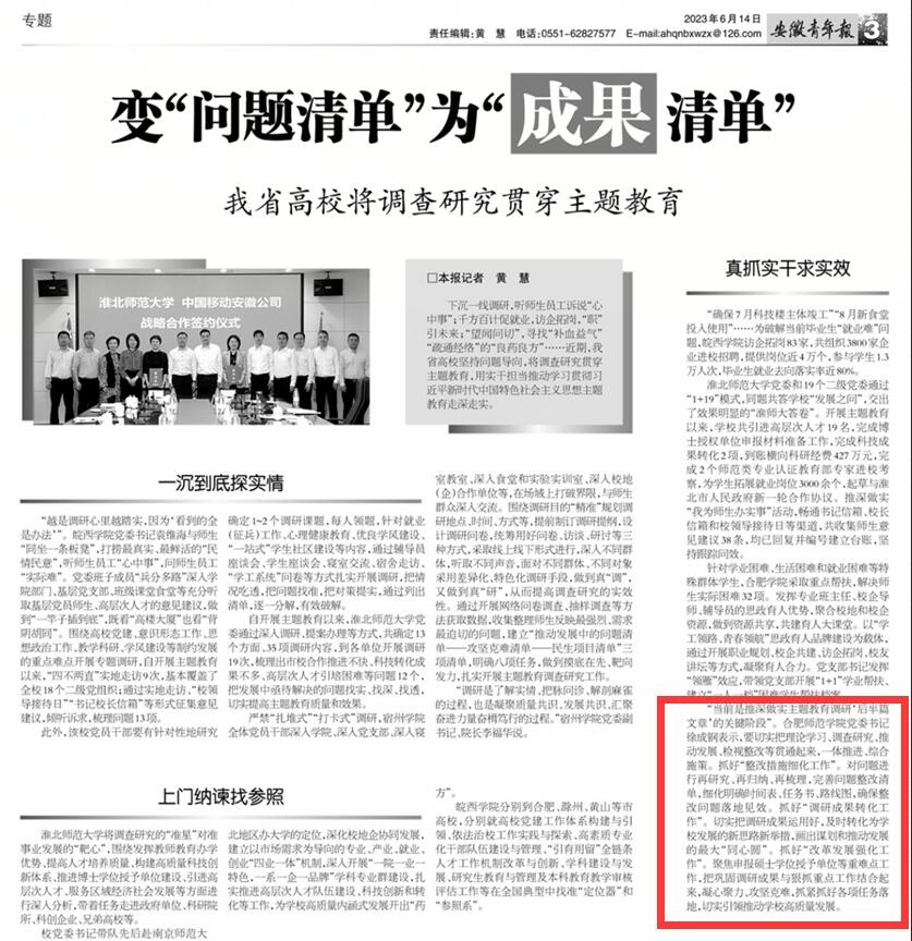 本网讯 6月14日,《安徽青年报》(第2224期)以《变“问题清单”为“成果清单”》为题,对beat365官网推深做实主题教育调研进行了报道。