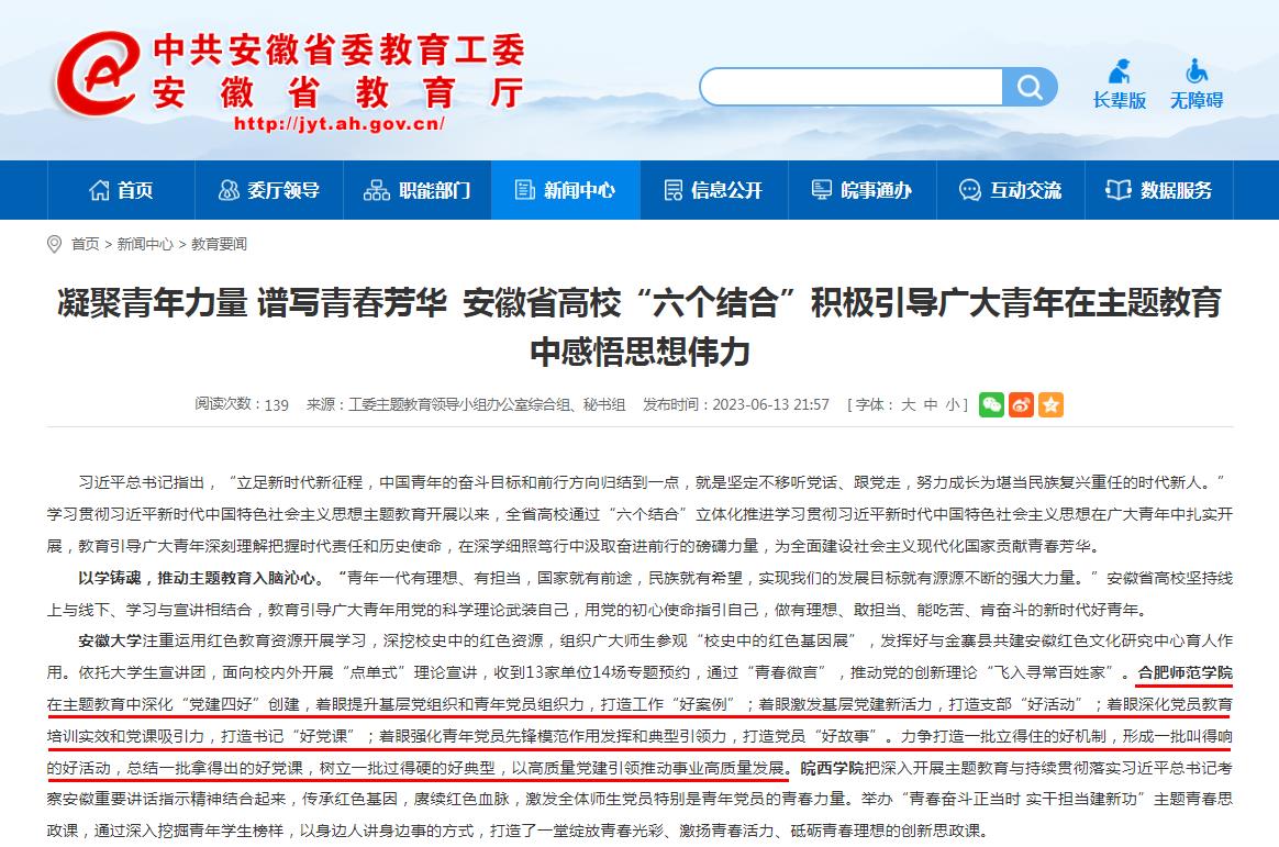 6月13日,安徽教育网以《凝聚青年力量 谱写青春芳华 安徽省高校“六个结合”积极引导广大青年在主题教育中感悟思想伟力》为标题,对此进行了报道。