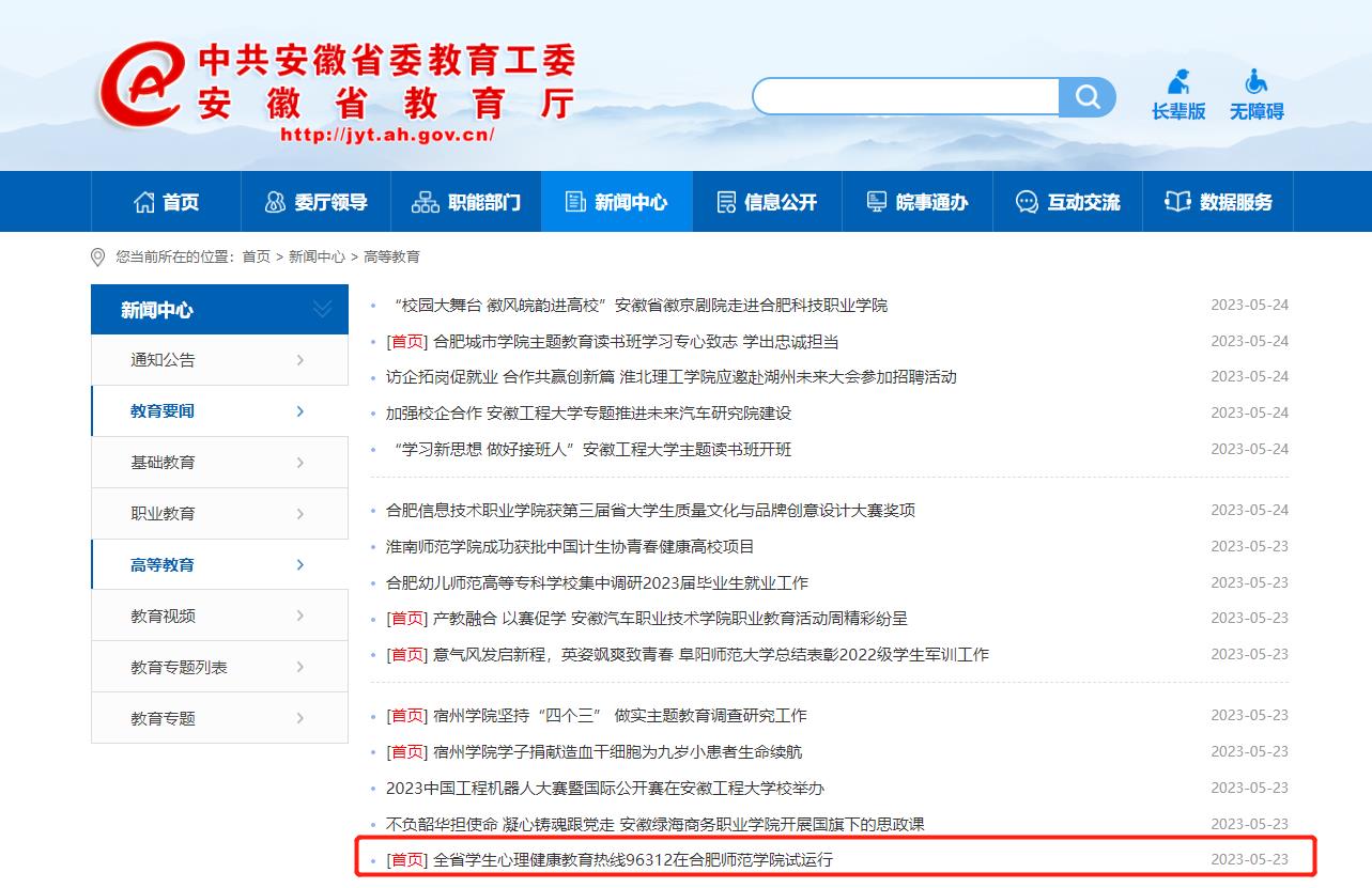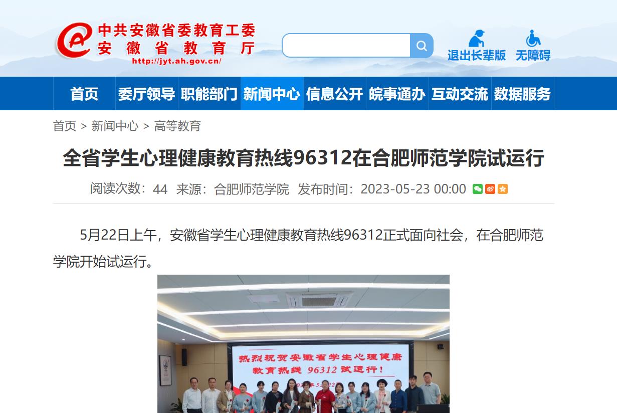 5月23日,安徽教育网首页以《全省学生心理健康教育热线96312在beat365中文官方网站试运行》为标题,对此进行了报道。