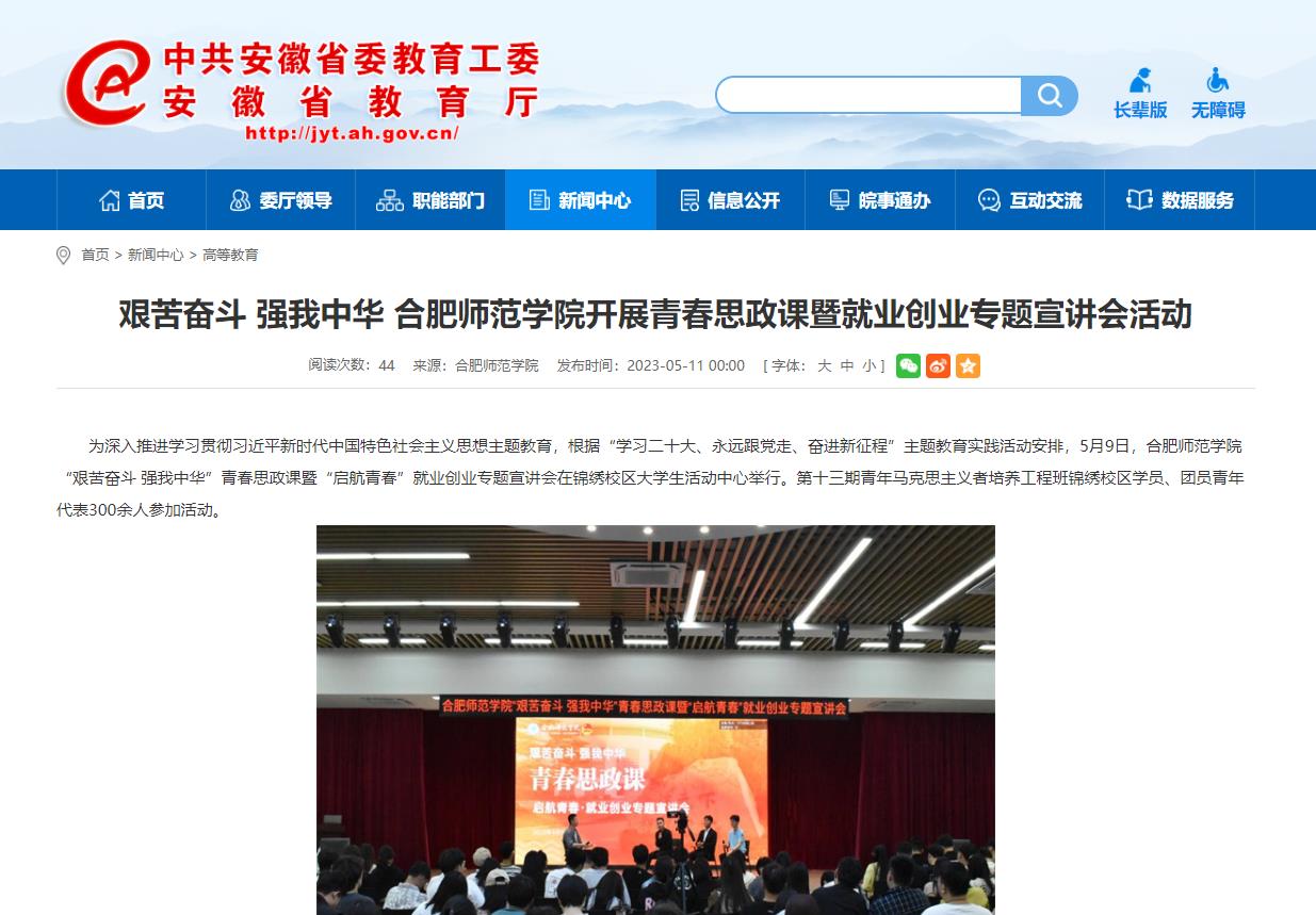 5月11日,安徽教育网以《艰苦奋斗 强我中华 beat365中文官方网站开展青春思政课暨就业创业专题宣讲会活动》为标题,对此进行了报道。