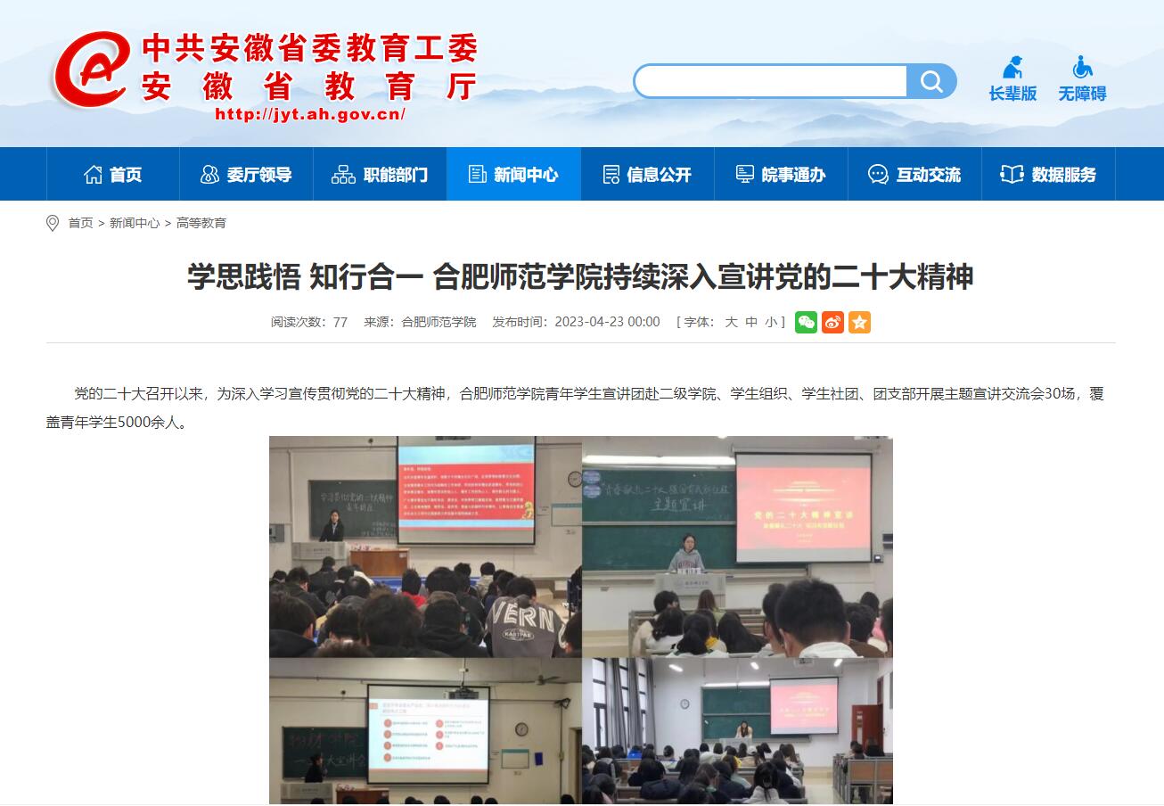 4月23日,安徽教育网以《学思践悟 知行合一 beat365中文官方网站持续深入宣讲党的二十大精神》为标题,对此进行了报道。