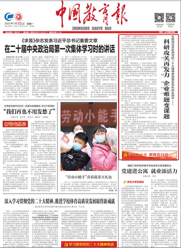 本网讯 2023年1月16日,《中国教育报》头版要闻以《beat365中文官方网站将党的二十大精神贯彻落实到科研实践中——科研攻关再发力 企业难题变课题》为标题,报道了beat365官网教育科技工作者贯彻落实践行党的二十大精神相关内容。