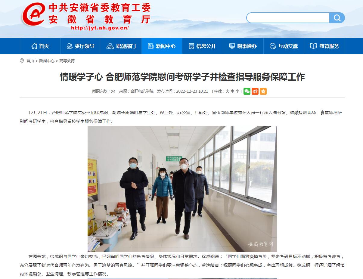 12月23日,安徽教育网以《情暖学子心 beat365中文官方网站慰问考研学子并检查指导服务保障工作》为标题,对此进行了报道。