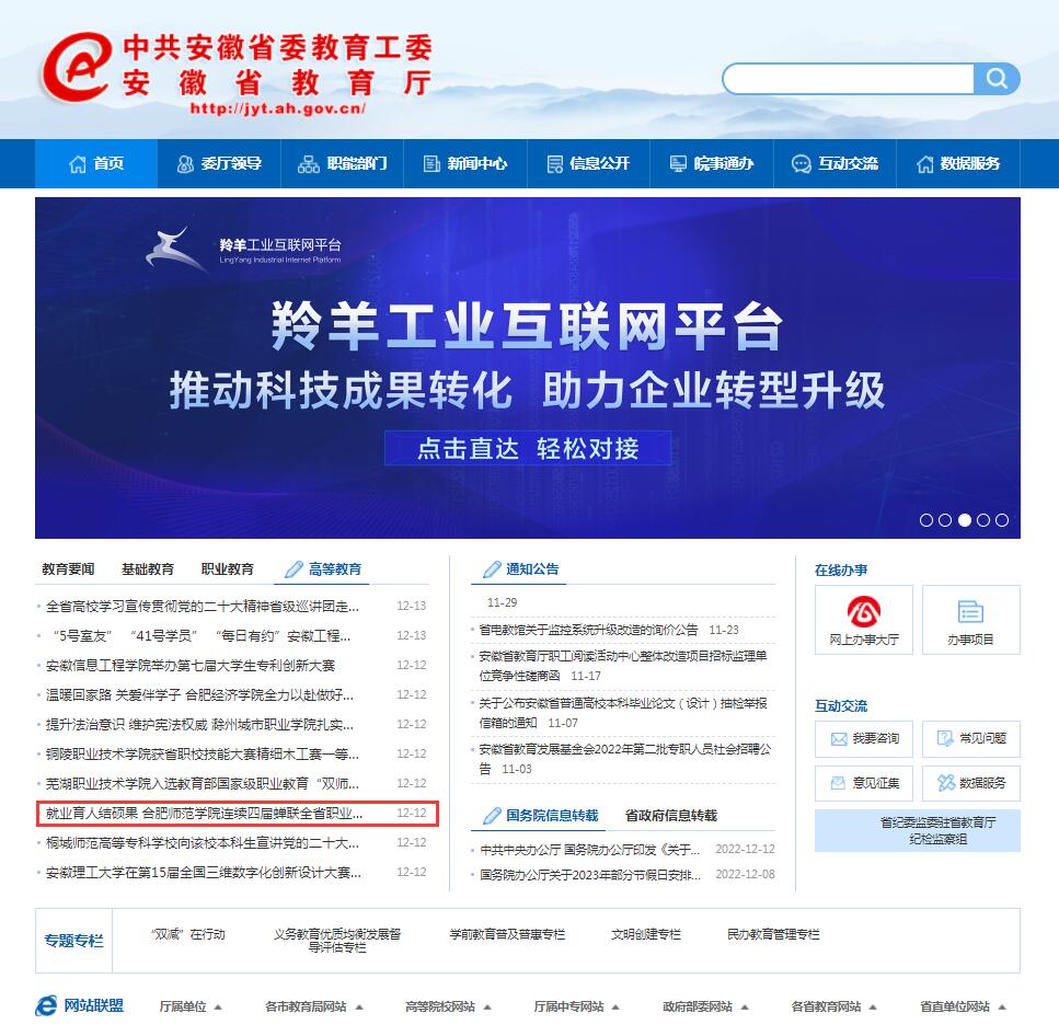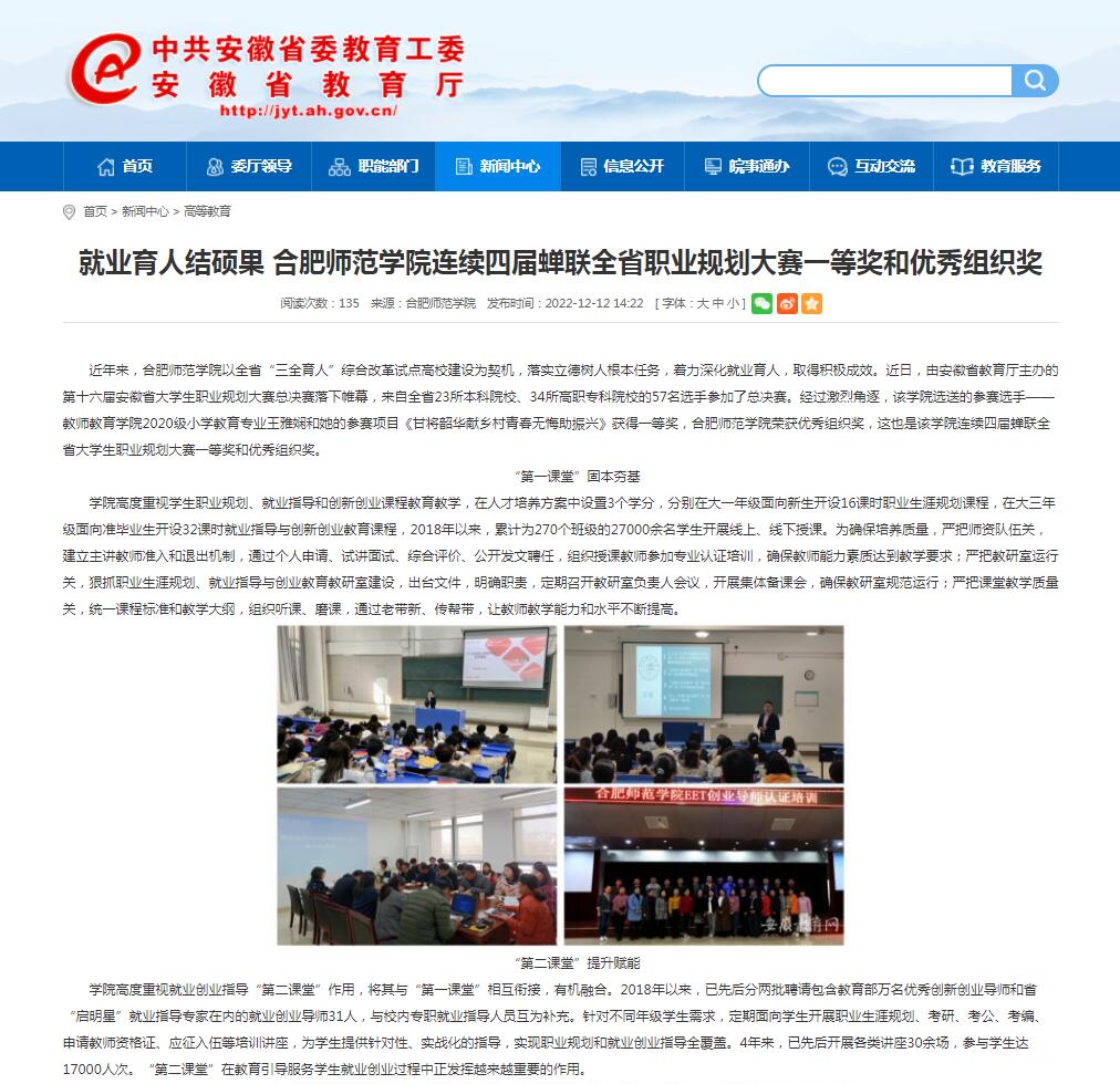 12月12日,安徽教育网首页以《就业育人结硕果 beat365中文官方网站连续四届蝉联全省职业规划大赛一等奖和优秀组织奖》为标题,对此进行了报道。