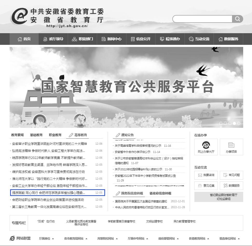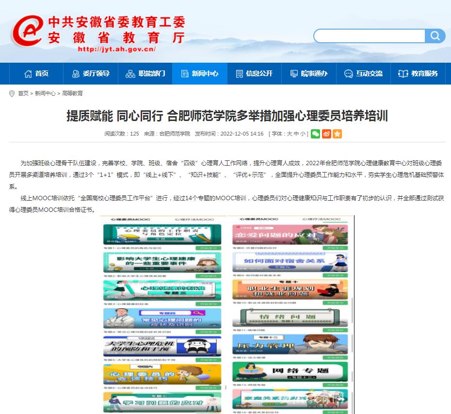 12月5日,安徽教育网首页以《提质赋能 同心同行 beat365中文官方网站多举措加强心理委员培养培训》为标题,对此进行了报道。