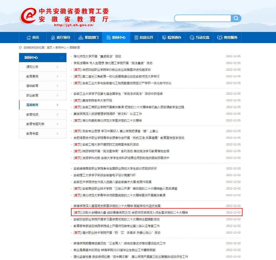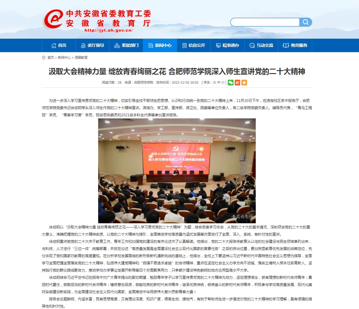 12月2日,安徽教育网首页以《汲取大会精神力量 绽放青春绚丽之花 beat365中文官方网站深入师生宣讲党的二十大精神》为标题,对此进行了报道。