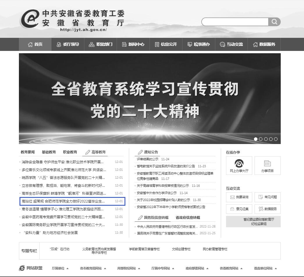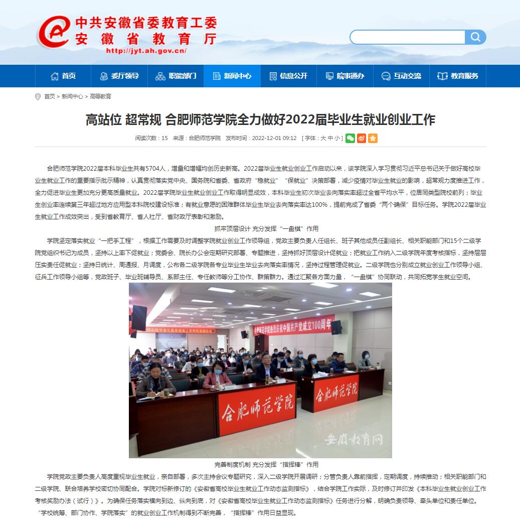 12月1日,安徽教育网首页以《高站位 超常规 beat365中文官方网站全力做好2022届毕业生就业创业工作》为标题,对此进行了报道。