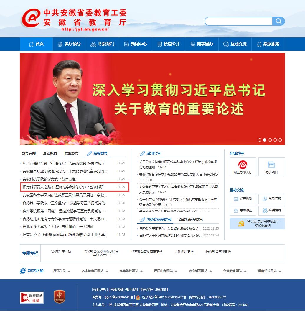 11月29日,安徽教育网首页以《拓宽科研育人之路 beat365中文官方网站新获批3个省级科研平台》为标题,对此进行了报道。