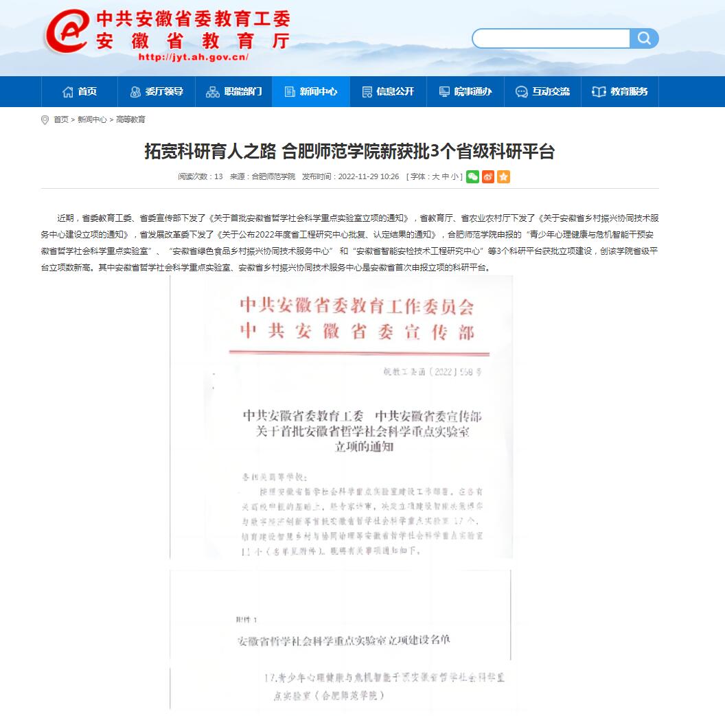 本网讯 近期,省委教育工委、省委宣传部下发了《关于首批安徽省哲学社会科学重点实验室立项的通知》,省教育厅、省农业农村厅下发了《关于安徽省乡村振兴协同技术服务中心建设立项的通知》,省发展改革委下发了《关于公布2022年度省工程研究中心批复、认定结果的通知》,学院申报的“青少年心理健康与危机智能干预安徽省哲学社会科学重点实验室”、“安徽省绿色食品乡村振兴协同技术服务中心” 和“安徽省智能安检技术工程研究中心”等3个科研平台获批立项建设,创该学院省级平台立项数新高。其中安徽省哲学社会科学重点实验室、安徽省乡村振兴协同技术服务中心是安徽省首次申报立项的科研平台。