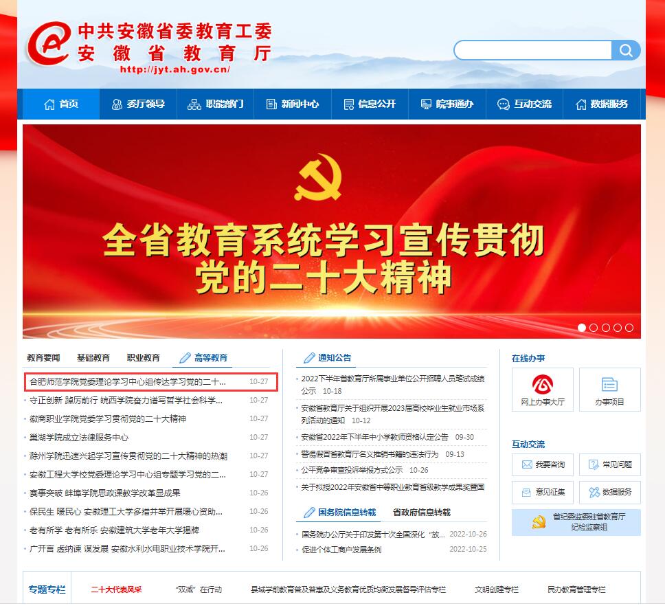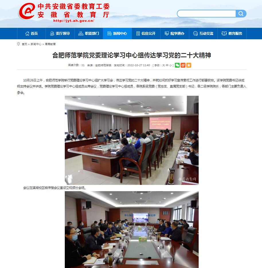 10月27日,安徽教育网首页以《beat365中文官方网站党委理论学习中心组传达学习党的二十大精神》为标题进行了报道。