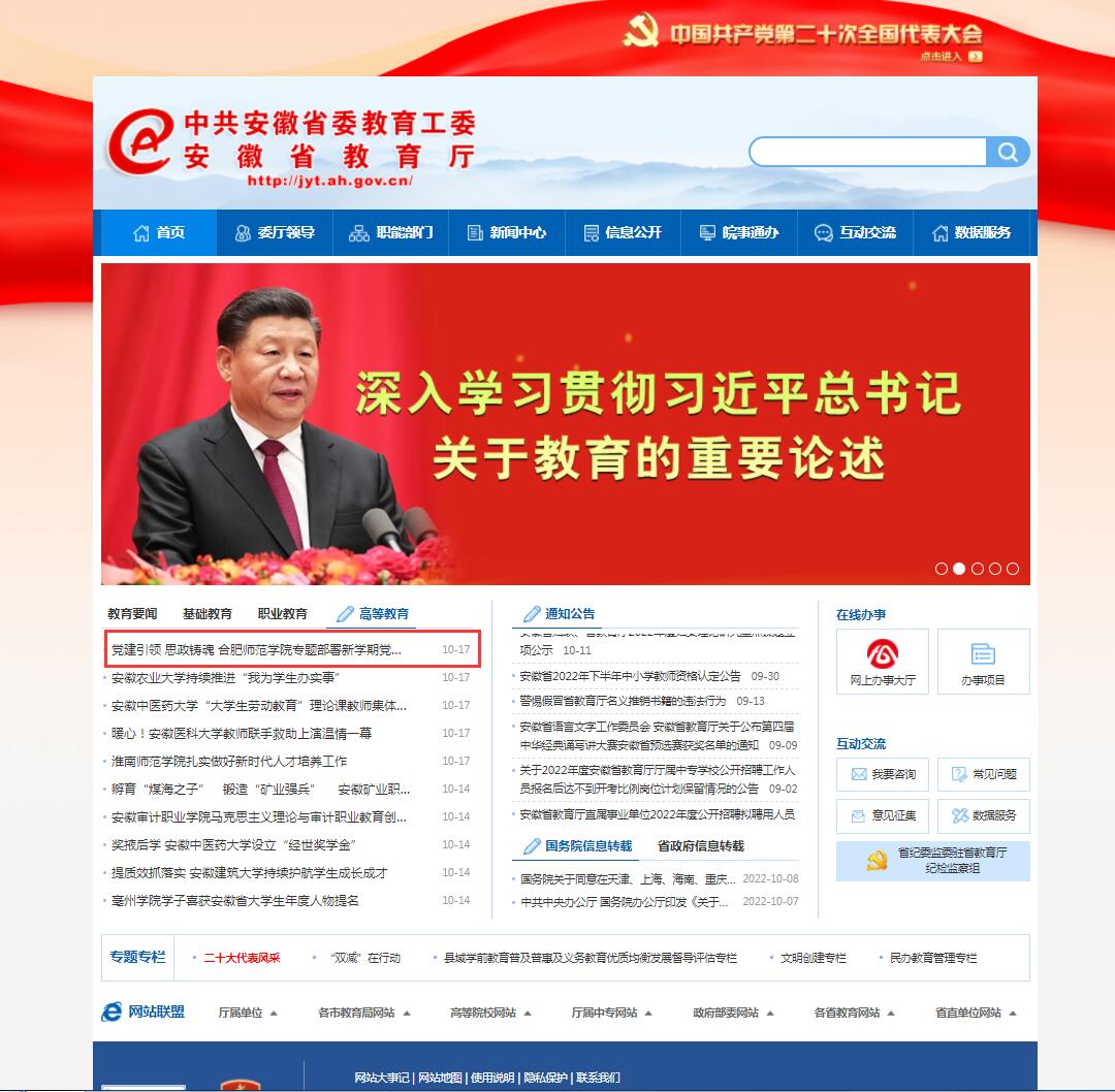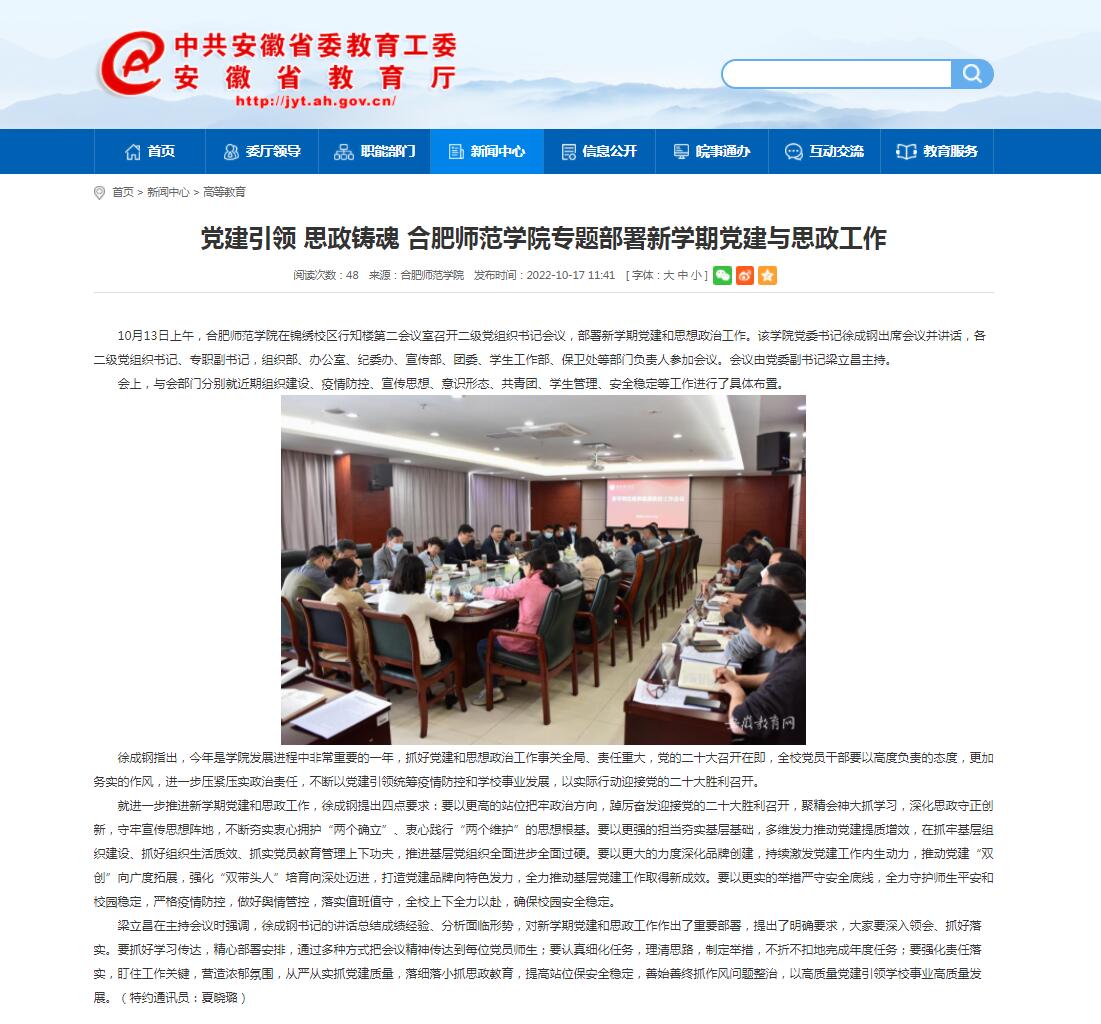 10月17日,安徽教育网首页以《党建引领 思政铸魂 beat365中文官方网站专题部署新学期党建与思政工作》为标题进行了报道。