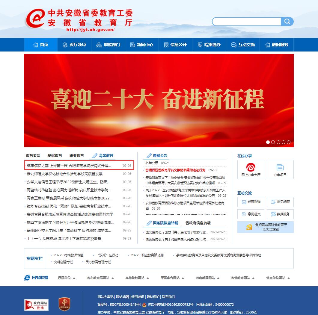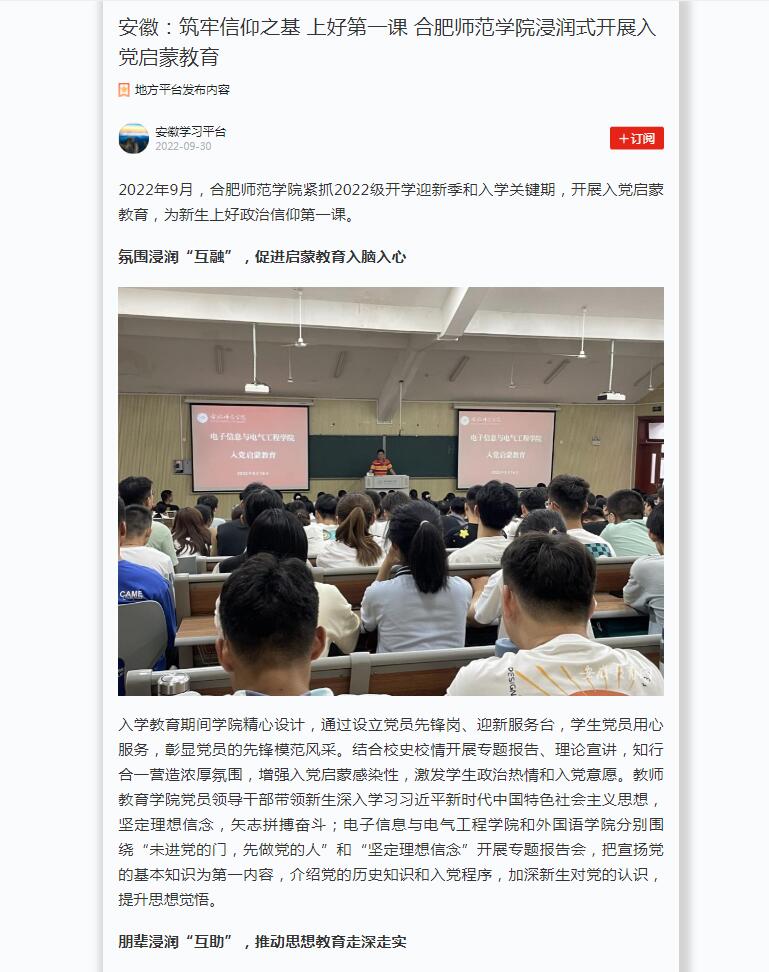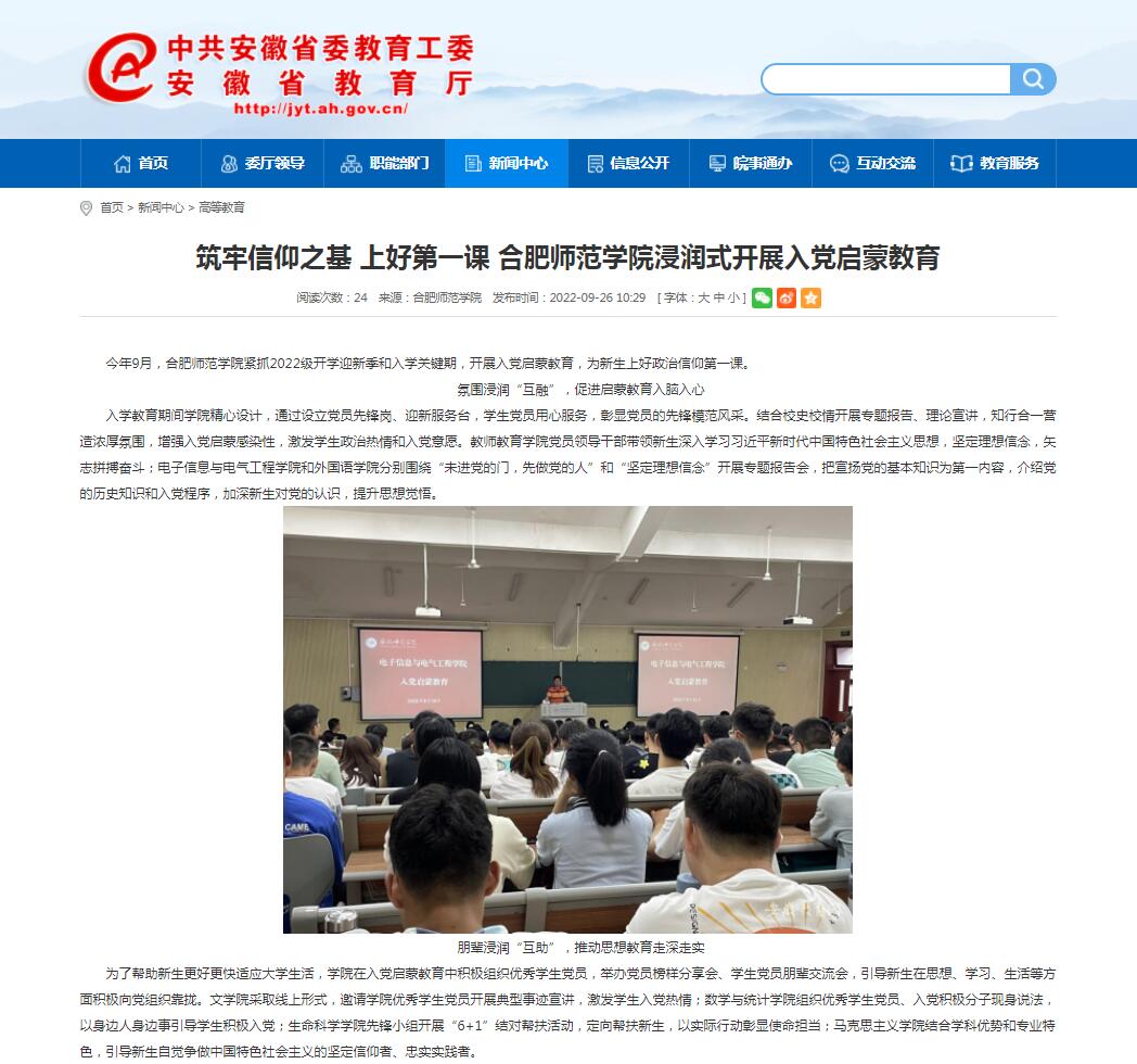 9月26日,安徽教育网首页以《筑牢信仰之基 上好第一课 beat365中文官方网站浸润式开展入党启蒙教育》进行了报道。