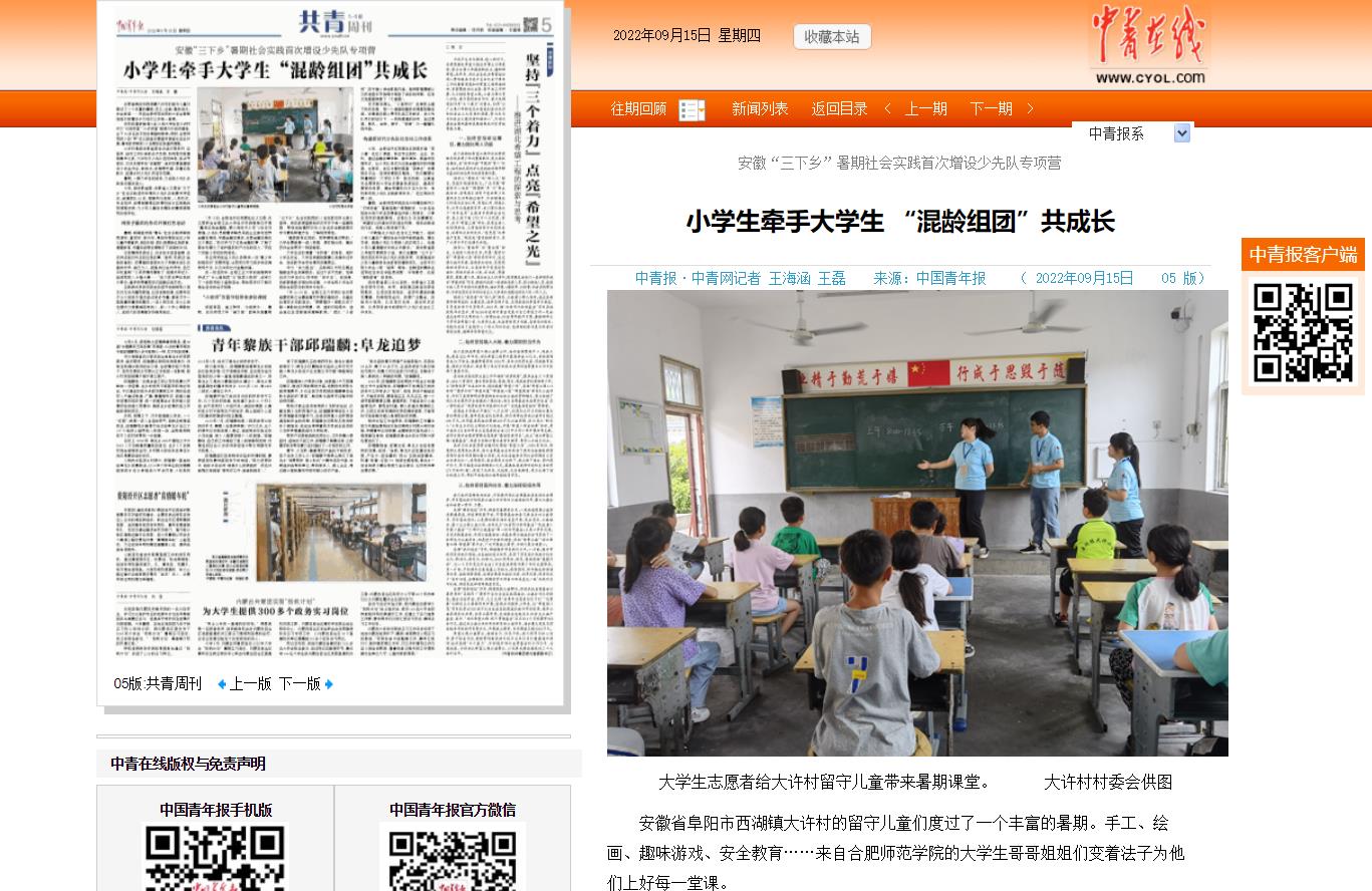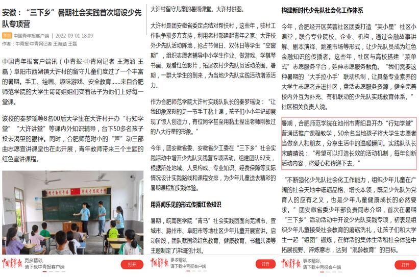 9月1日,中国青年报客户端以《安徽:“三下乡”暑期社会实践首次增设少先队专项营》为题,对此进行了报道。