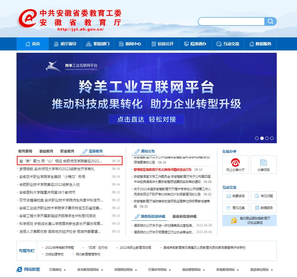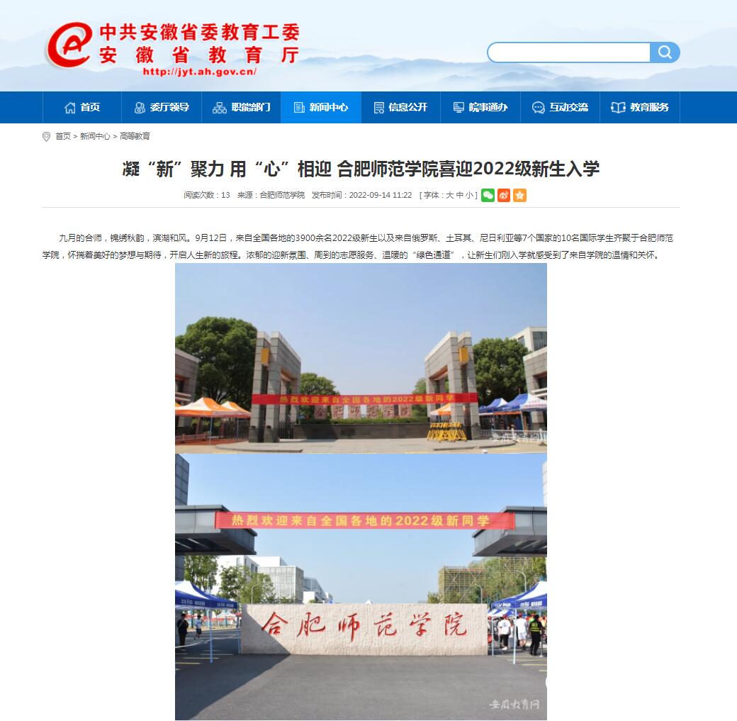 9月14日,安徽教育网首页以《凝“新”聚力 用“心”相迎 beat365中文官方网站喜迎2022级新生入学》为标题进行了报道。
