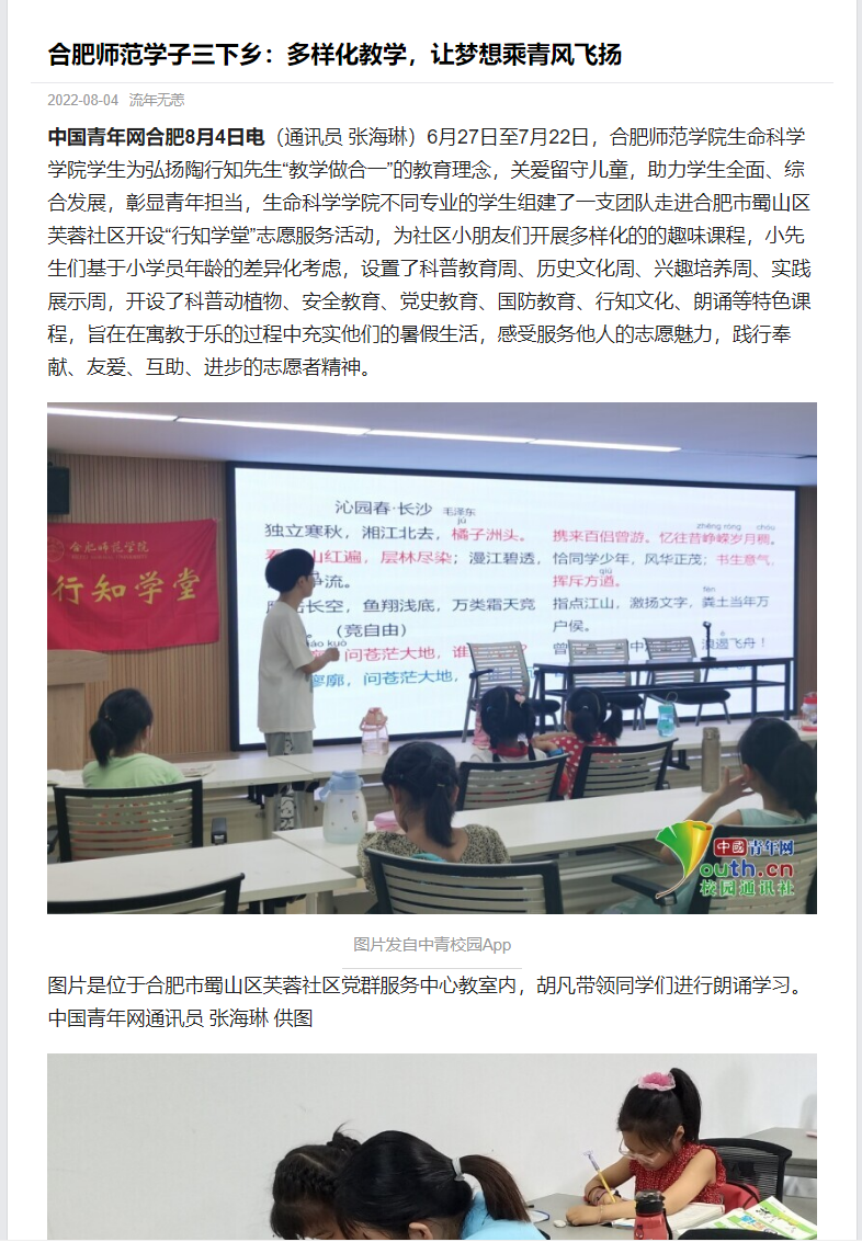 本网讯 为进一步发扬行知精神,弘扬行知文化,培养当代大学生社会责任感,生命科学学院积极动员学生参加“行知学堂”暑期实践活动,学生热情高涨。三个团队受到了《中国青年网》媒体的报道,其中包括卫塘社区“银菱阳光少年”行知学堂、合肥市蜀山区芙蓉社区行知学堂、六安霍邱县行知学堂。