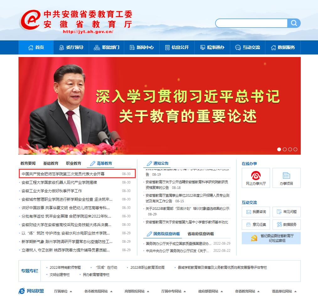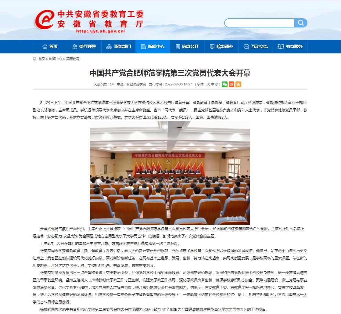 8月30日,安徽教育网首页以《中国共产党beat365中文官方网站第三次党员代表大会开幕》为标题进行了报道。