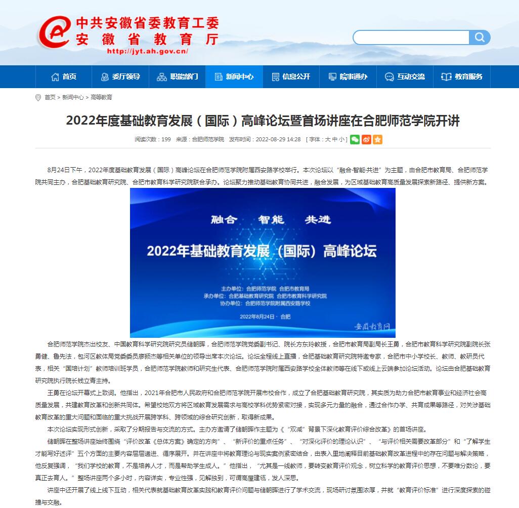 8月29日,安徽教育网以《2022年度基础教育发展(国际)高峰论坛暨首场讲座在beat365中文官方网站开讲》为标题进行了报道。