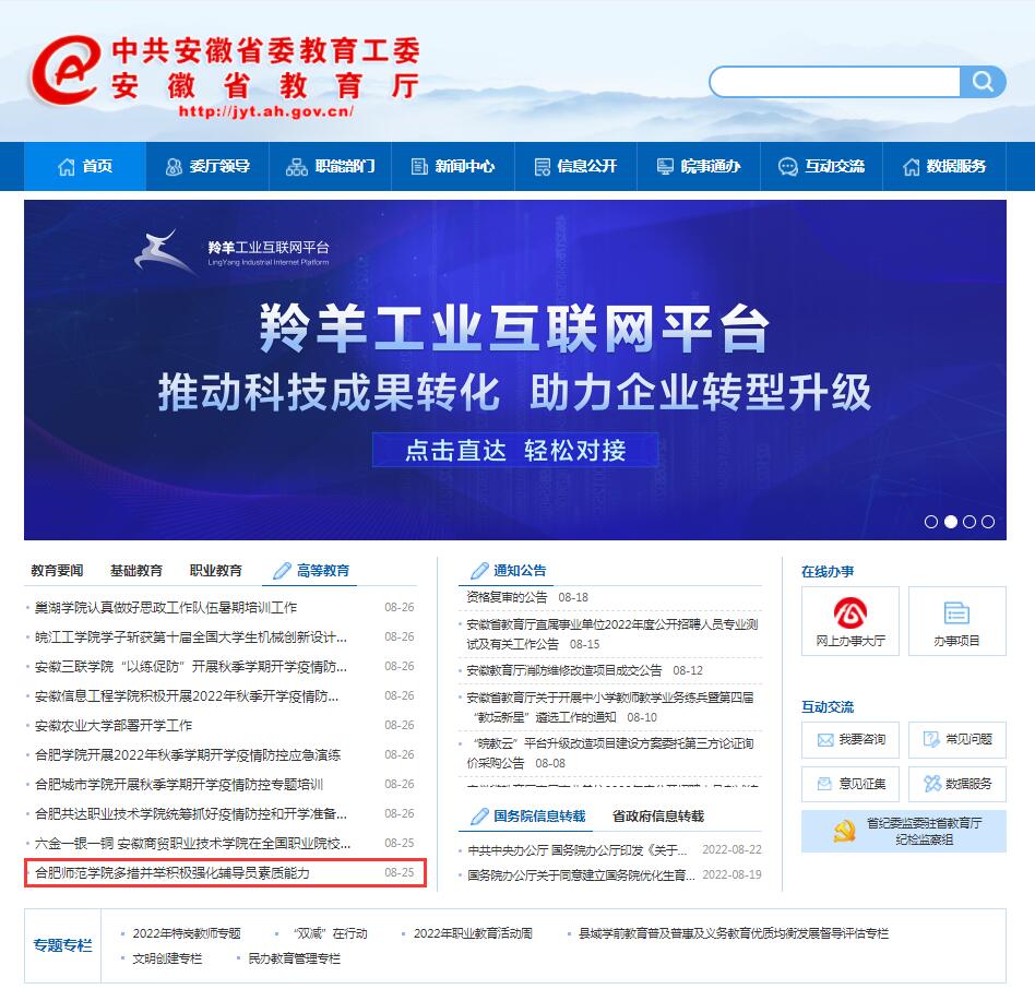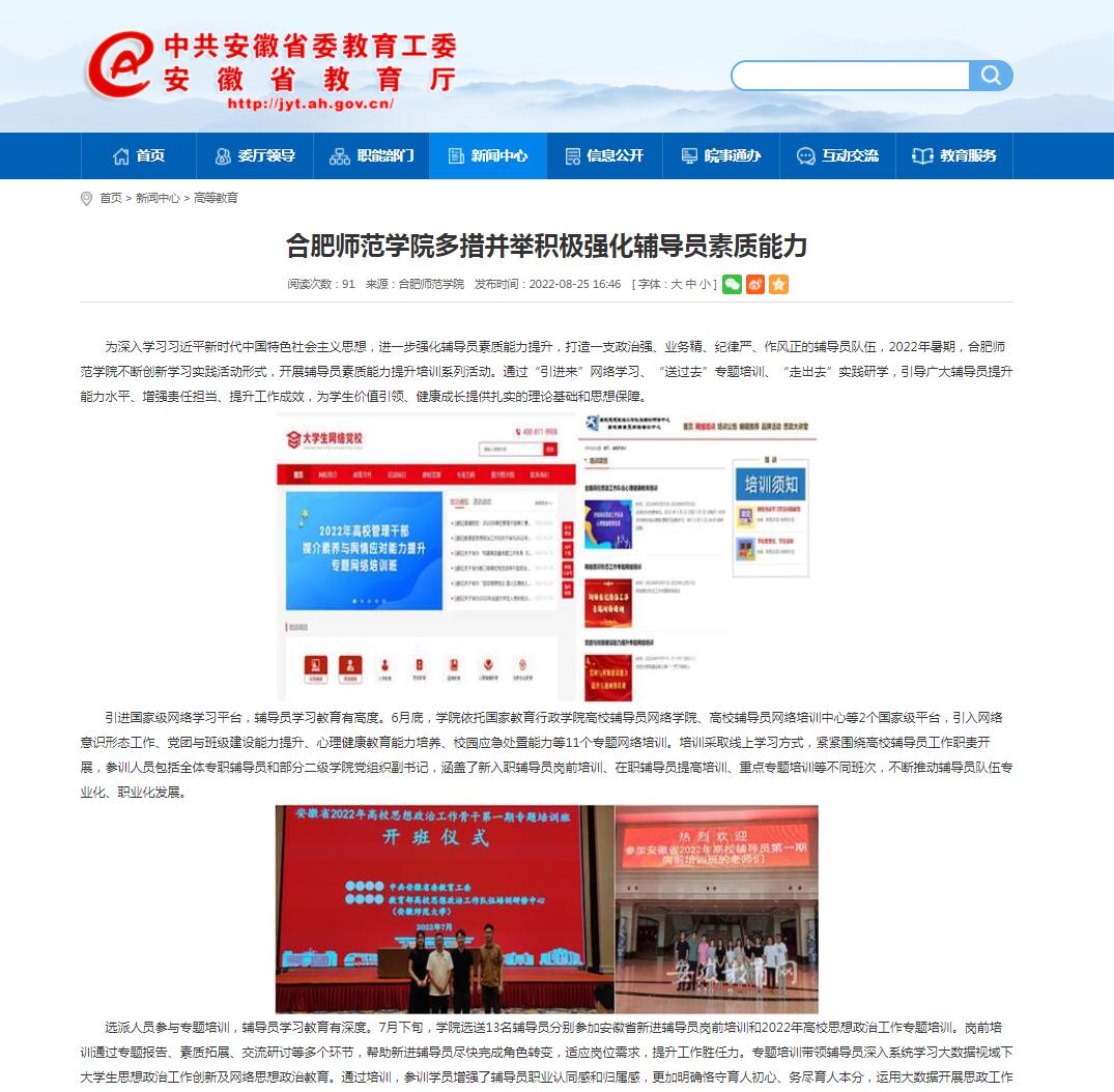 8月25日,安徽教育网首页以《beat365中文官方网站多措并举积极强化辅导员素质能力》为标题进行了报道。
