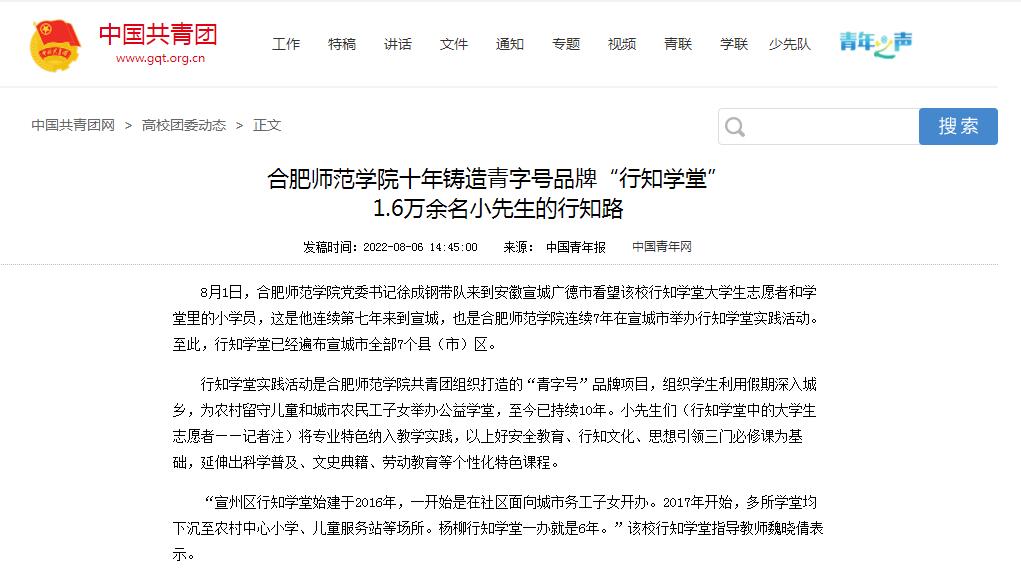 本网讯 8月6日,中国共青团网以《beat365中文官方网站十年铸造青字号品牌“行知学堂”:1.6万余名小先生的行知路》为题,报道了我院“行知学堂”实践活动十周年历程。报道介绍了学院连续7年在宣城市举办行知学堂实践活动经历及十年来涌现出的基地学堂、特色课程、典型人物等事迹。(院团委)
