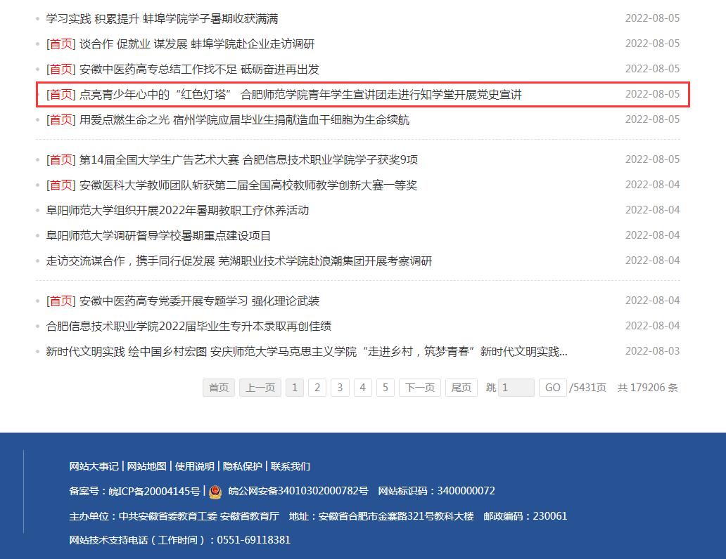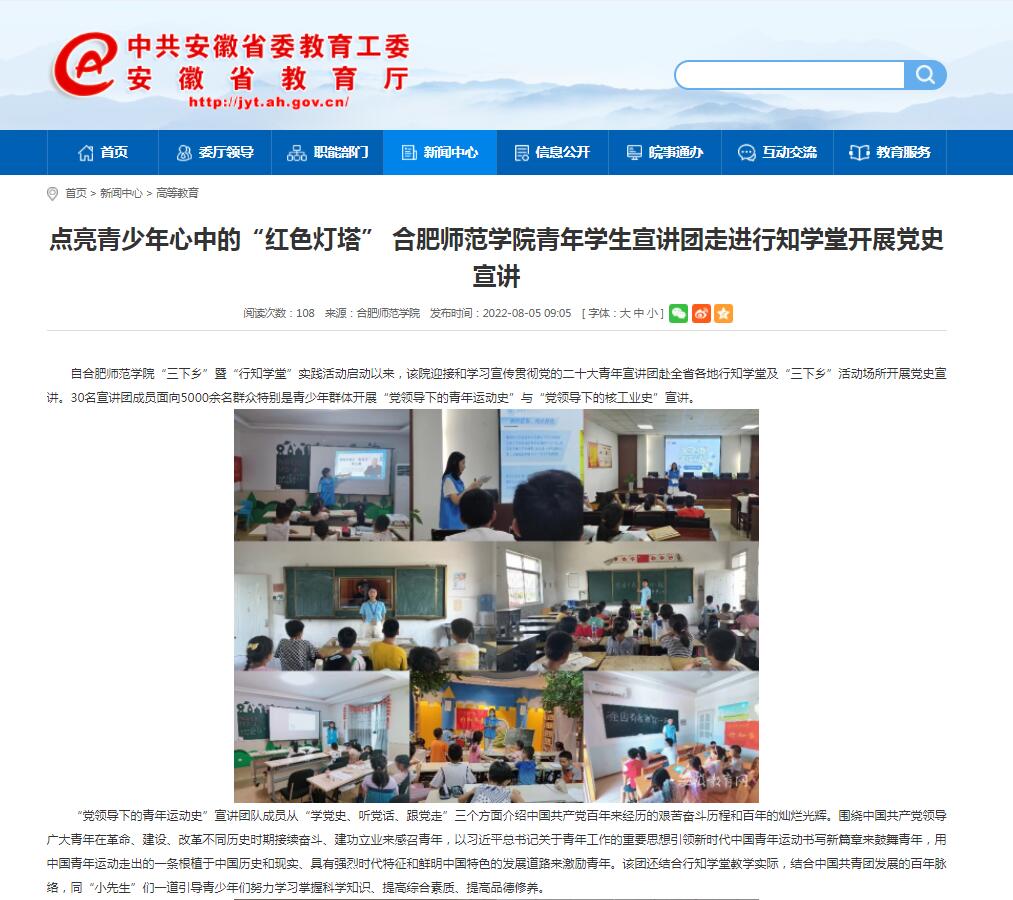 8月5日,安徽教育网首页以《点亮青少年心中的“红色灯塔” beat365中文官方网站青年学生宣讲团走进行知学堂开展党史宣讲》为标题进行了报道。(宣传部)