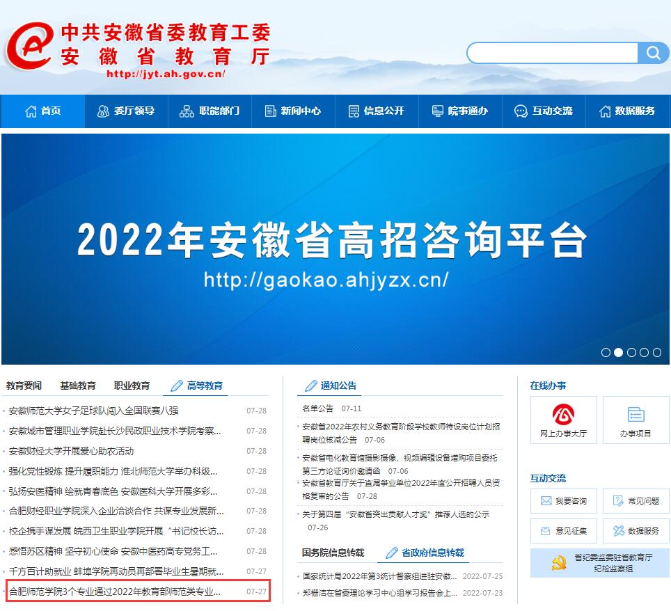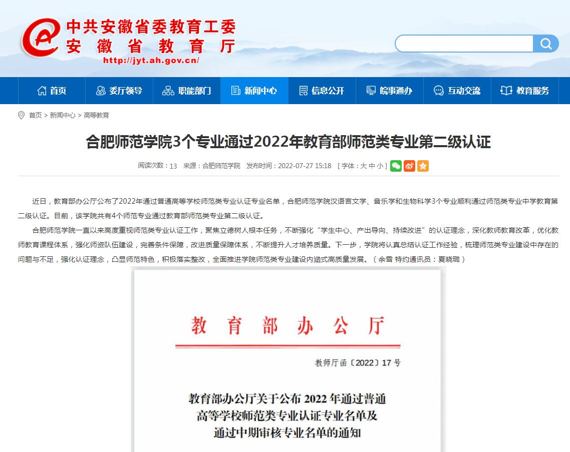 7月27日,安徽教育网首页以《beat365中文官方网站3个专业通过2022年教育部师范类专业第二级认证》为标题进行了报道。