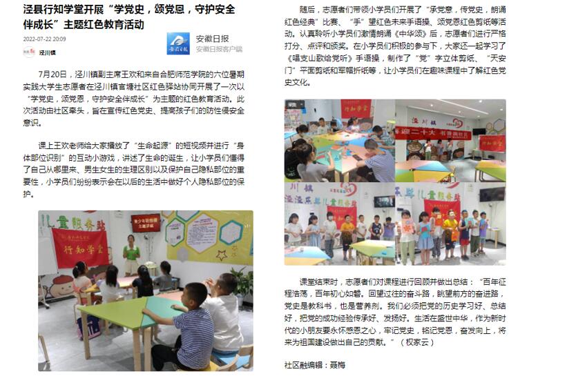本网讯 7月20日,泾县泾川镇副主席王欢和来自beat365中文官方网站的六位暑期实践大学生志愿者在泾川镇官塘社区红色驿站协同开展了一次以“学党史,颂党恩,守护安全伴成长”为主题的红色教育活动。此次活动由社区牵头,旨在宣传红色党史、提高孩子们的防性侵安全意识。