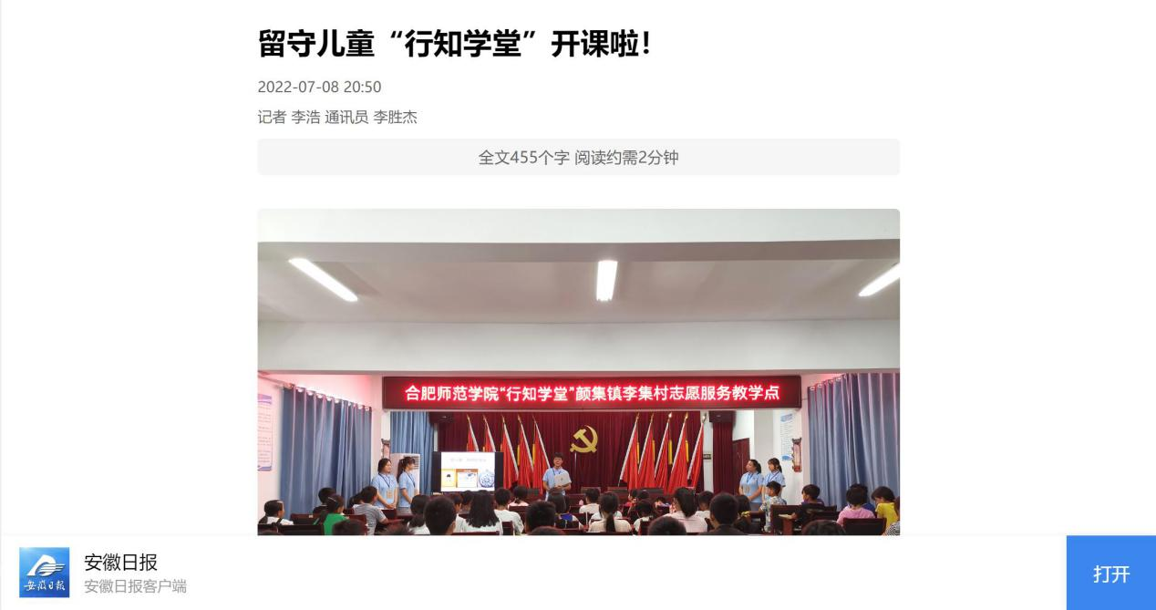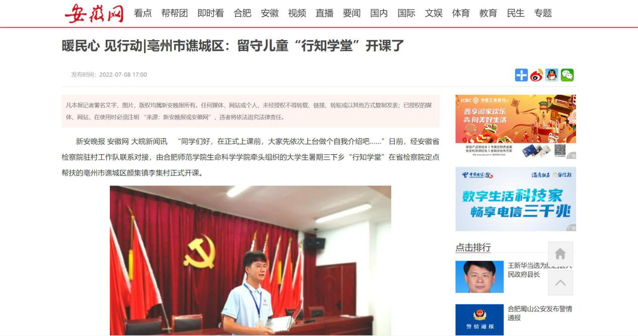 本网讯 近日,生命科学学院牵头举办的亳州市谯城区开办的“颜集行知学堂”成功开班,引起了社会各大媒体的广泛关注。《安徽日报》、《新安晚报》、《中安在线》等多个媒体对此进行报道,安徽省人民检察院官方微信公众号转载报道。