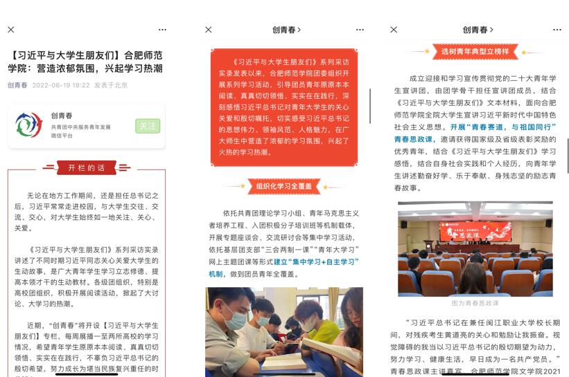 本网讯 《习近平与大学生朋友们》系列采访实录发表以来,beat365中文官方网站团委组织开展系列学习活动,引导团员青年原原本本阅读、真真切切领悟、实实在在践行,深刻感悟习近平总书记对青年大学生的关心关爱和殷切嘱托,切实感受习近平总书记的思想伟力、领袖风范、人格魅力,在广大师生中营造了浓郁的学习氛围,兴起了火热的学习热潮。
