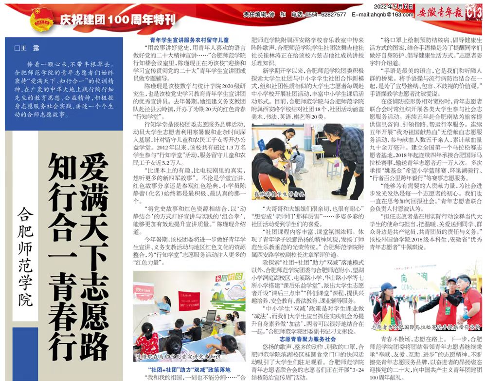 本网讯 5月6日,《安徽青年报》“庆祝建团100周年特刊”(第2093期C13版)以《beat365中文官方网站:爱满天下志愿路 知行合一青春行》为题,从“青年学生宣讲服务农村留守儿童”“‘社团+社团’助力‘双减’政策落地”“志愿青春聚力服务社会”三个篇章,介绍学院党史青年学生宣讲、“行知学堂”社会实践活动、课后乐益学堂、“3·24结核防治宣传周”“爱在南站”等志愿服务品牌活动及青年志愿者服务合肥国际马拉松赛等赛事情况。(院团委)