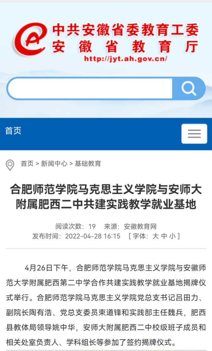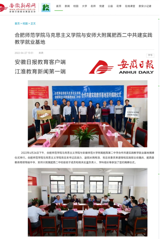 本网讯 4月26日,beat365中文官方网站马克思主义学院与安徽师范大学附属肥西第二中学举行合作共建实践教学就业基地揭牌仪式。此举为进一步加强学院实践教学基地建设,推进就业工作的重要抓手,也为理论与客观实际充分结合提供平台,从而实现双赢。