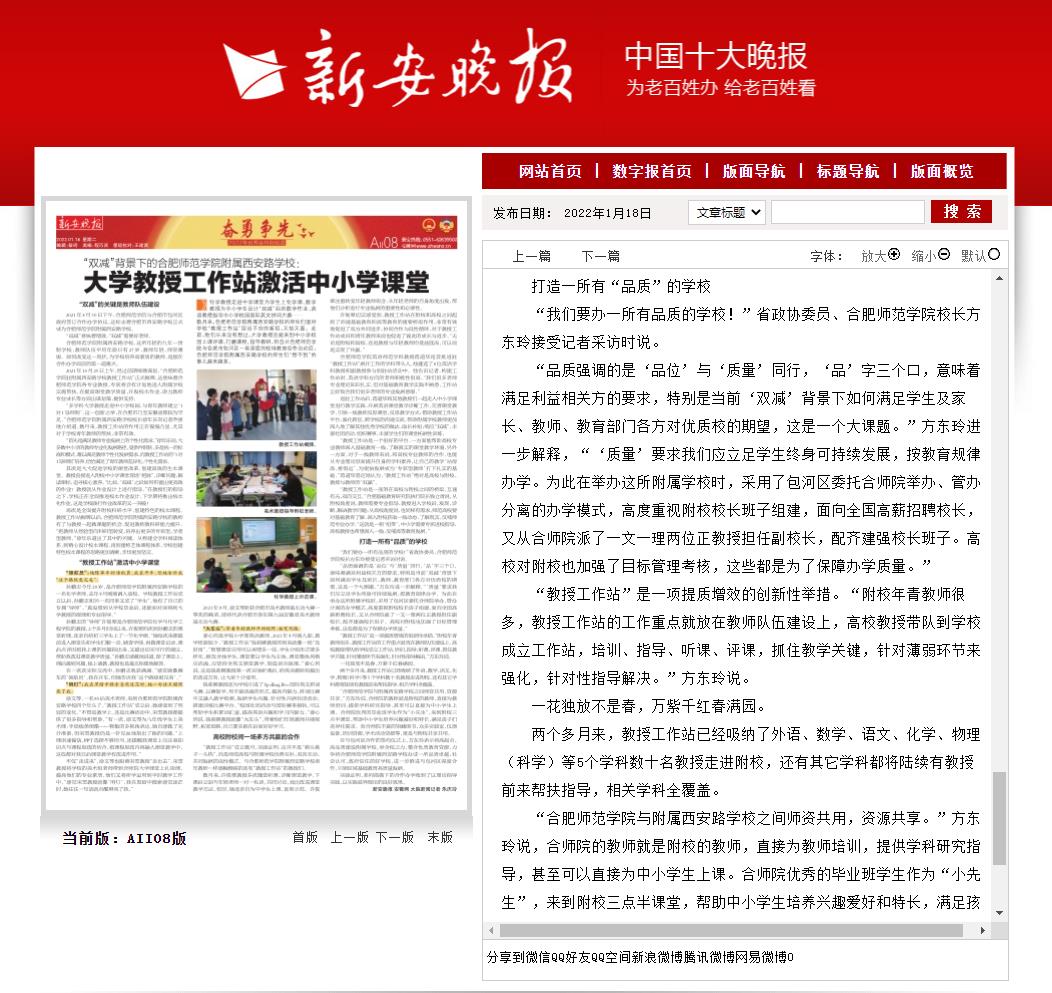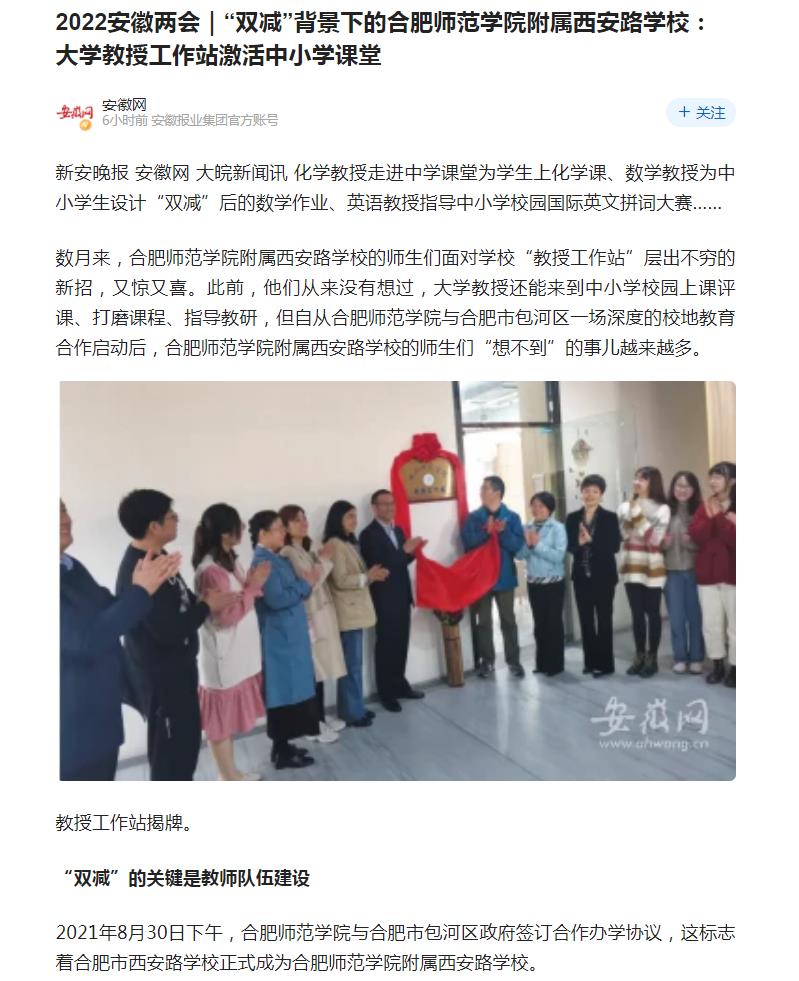 1月18日,《新安晚报》、安徽网以《“双减”背景下的beat365中文官方网站附属西安路学校:大学教授工作站激活中小学课堂》为题,对此进行了报道。1月18日,中国网韵动安徽频道以《beat365中文官方网站附属西安路学校多举措打出“双减”组合拳》为题,对此进行了报道。
