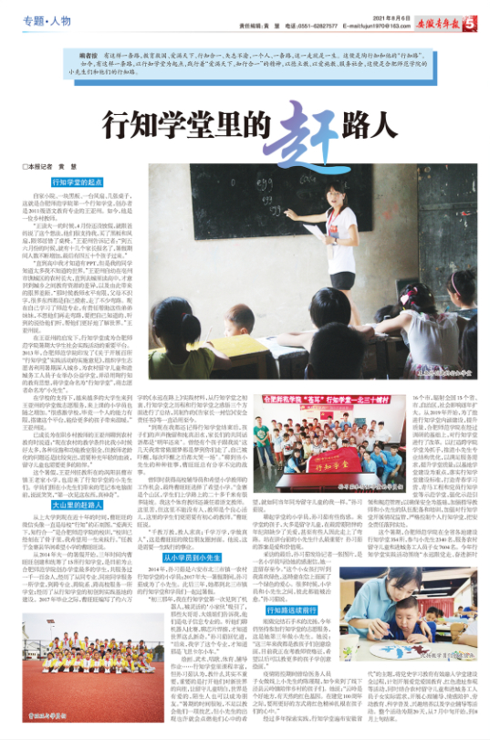 本网讯 8月6日,《安徽青年报》在“专题·人物(05版)”以《行知学堂里的赶路人》专题报道我院行知学堂小先生王亚州、曹旺旺、孙习茹、沈杨、陈瑾琨的事迹。报道以“行知学堂的起点” “大山里的赶路人”“从小学员到小先生”“行知路远续前行”为主题,从四个篇章依次讲述了王亚州创建全校第一所“行知学堂”的始末、曹旺旺与其创建和统筹了15所行知学堂、孙习茹从小学员成长为“小先生”、沈杨和陈瑾琨在行知路上接续前行的故事。生动的描绘了我院学子以行知学堂为起点,践行着“爱满天下,知行合一”的精神,以德立教、以爱施教、服务社会的行知学堂“小先生画像”。(院团委:王露)