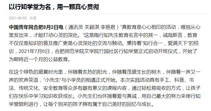 本网讯 7月6日,文学院竹园社区“行知学堂”正式启动开班仪式,为期将近一个月的公益实践活动就此拉开了帷幕。本次实践活动安排了手工、科普、书法、传统文化、安全教育等众多有趣有意义的课程内容,通过轻松易吸收的方式,让孩子们在快乐中学习知识收获成长。“小先生”们也怀揣着爱与真诚,用自己努力付出来使行知学堂顺利进行,让学堂的每个孩子都拥有属于自己美好的回忆与成长。