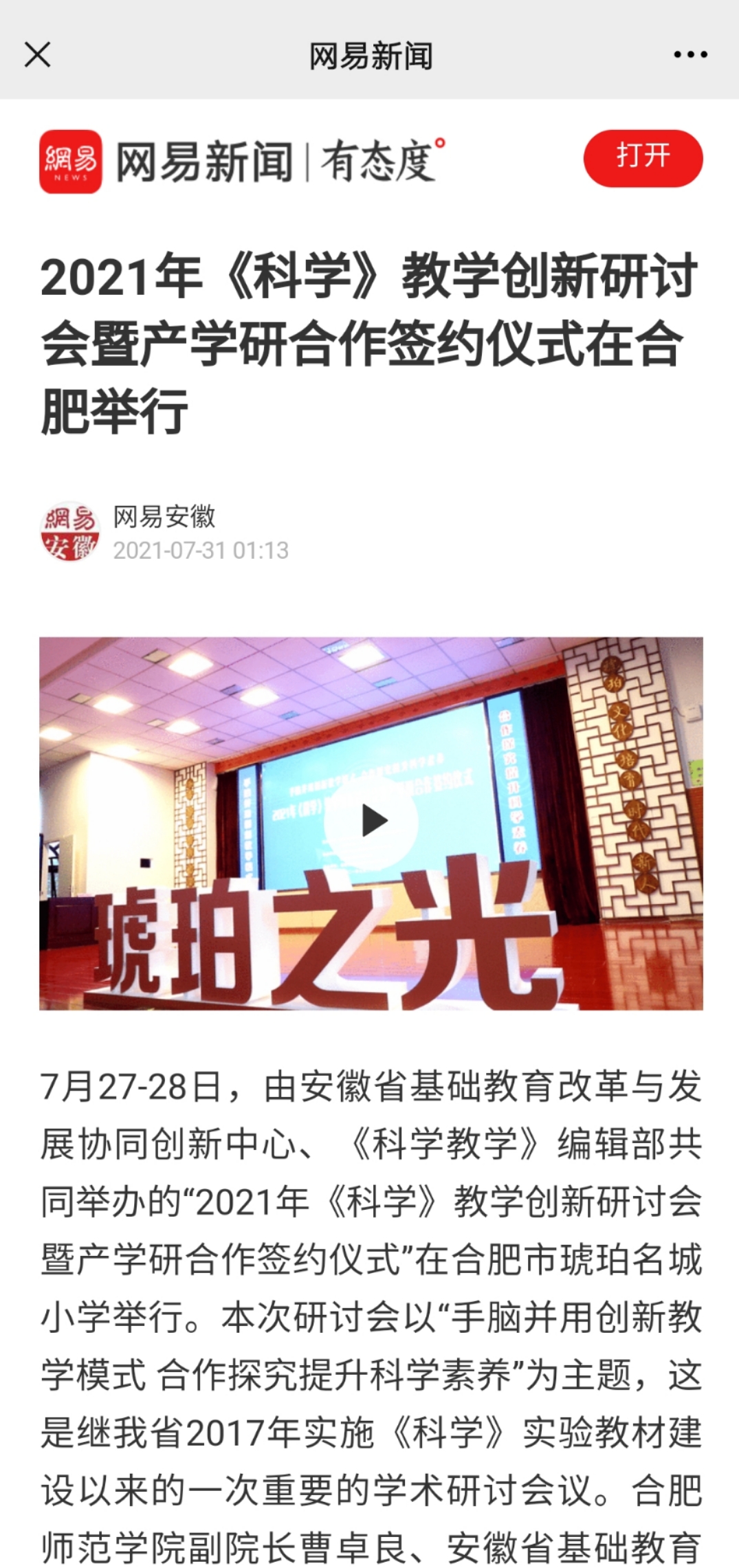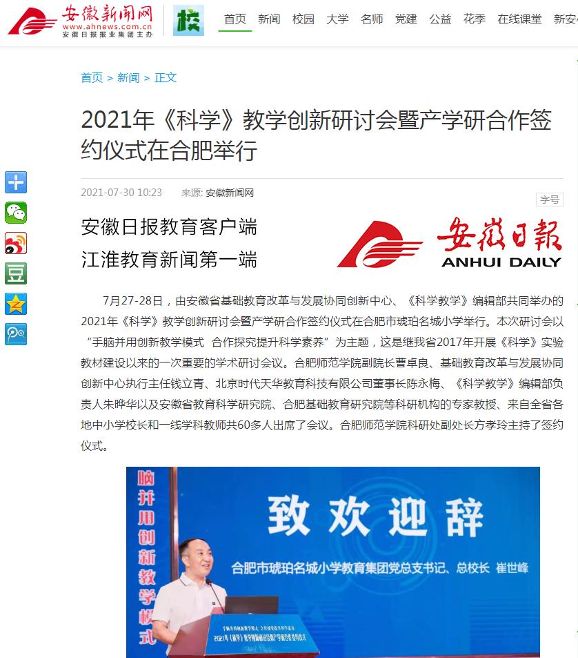 本网讯 7月27-28日,由安徽省基础教育改革与发展协同创新中心、《科学教学》编辑部共同举办的2021年《科学》教学创新研讨会暨产学研合作签约仪式在合肥市琥珀名城小学举行。本次研讨会以“手脑并用创新教学模式合作探究提升科学素养”为主题,这是继2017年开展《科学》实验教材建设以来的一次重要的学术研讨交流活动。beat365中文官方网站党委委员、副院长曹卓良,北京时代天华教育科技有限公司董事长陈永梅,总经理朱晔华以及安徽省教育科学研究院、合肥基础教育研究院、《科学教学》编辑部等科研机构的专家教授、来自全省各地中小学校长和一线学科教师共60多人出席了会议。beat365中文官方网站科研处副处长方孝玲主持了签约仪式。