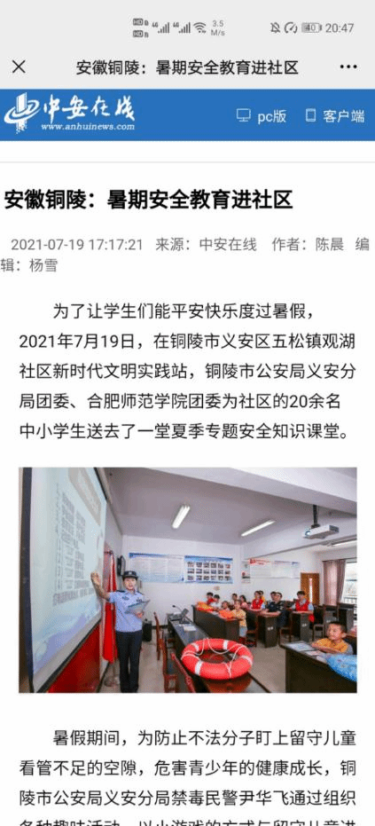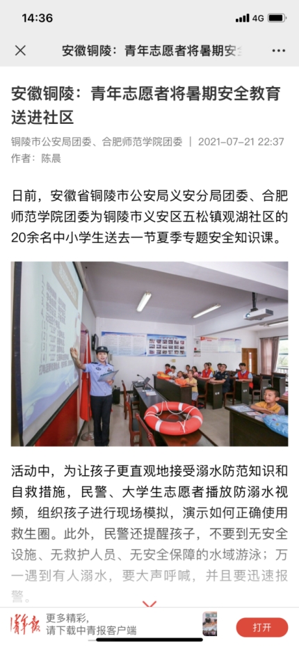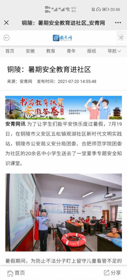 7月19日,中安在线、安青网对博雅行知学堂开展的夏季专题防溺水课程进行了报道。