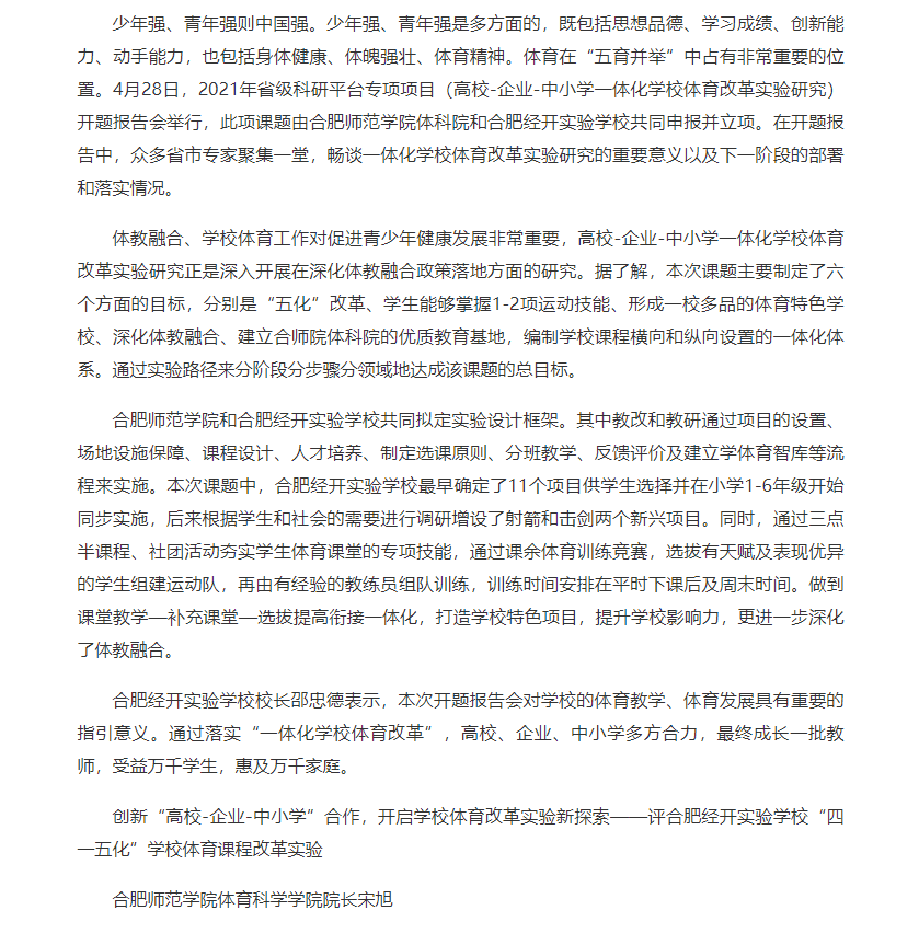 本网讯 4月28日上午,2021年省级科研平台专项项目(高校-企业-中小学一体化学校体育改革实验研究)开题报告会在合肥经开区实验学校举行,此项课题由beat365中文官方网站体育科学学院和合肥经开实验学校共同申报并立项。此举是贯彻落实国家体育总局、教育部深化体教融合、促进青少年健康发展的重要举措,创新“高校-企业-中小学”合作,开启学校体育改革实验新探索。
