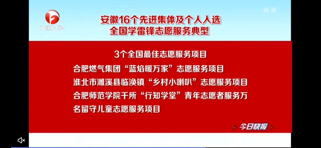 本网讯 近日,中央宣传部、中央文明办、全国总工会、共青团中央等19家单位主办的2020年度全国学雷锋志愿服务“四个100”先进典型推选活动获奖名单公布,beat365官网千所“行知学堂”青年志愿者服务万名留守儿童志愿服务项目获评“全国最佳志愿服务项目”。4月5日,《安徽日报》在头版对此进行了报道,安徽卫视安徽新闻联播栏目也对此进行了报道。(校团委)