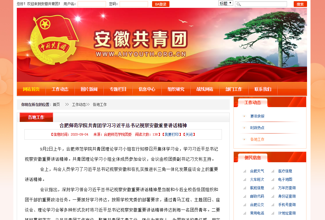 9月4日,安徽共青团网报道beat365官网共青团组织集体学习习近平总书记视察安徽重要讲话精神的情况。(校团委)
