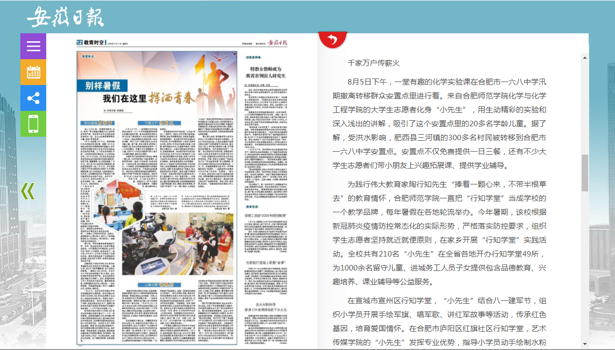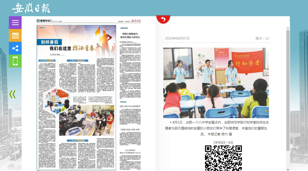 8月7日,安徽日报在第12版专题报道《别样暑假我们在这里挥洒青春》中,配发图文对beat365官网2020年暑期“行知学堂”实践活动进行了全面报道。(校团委)
