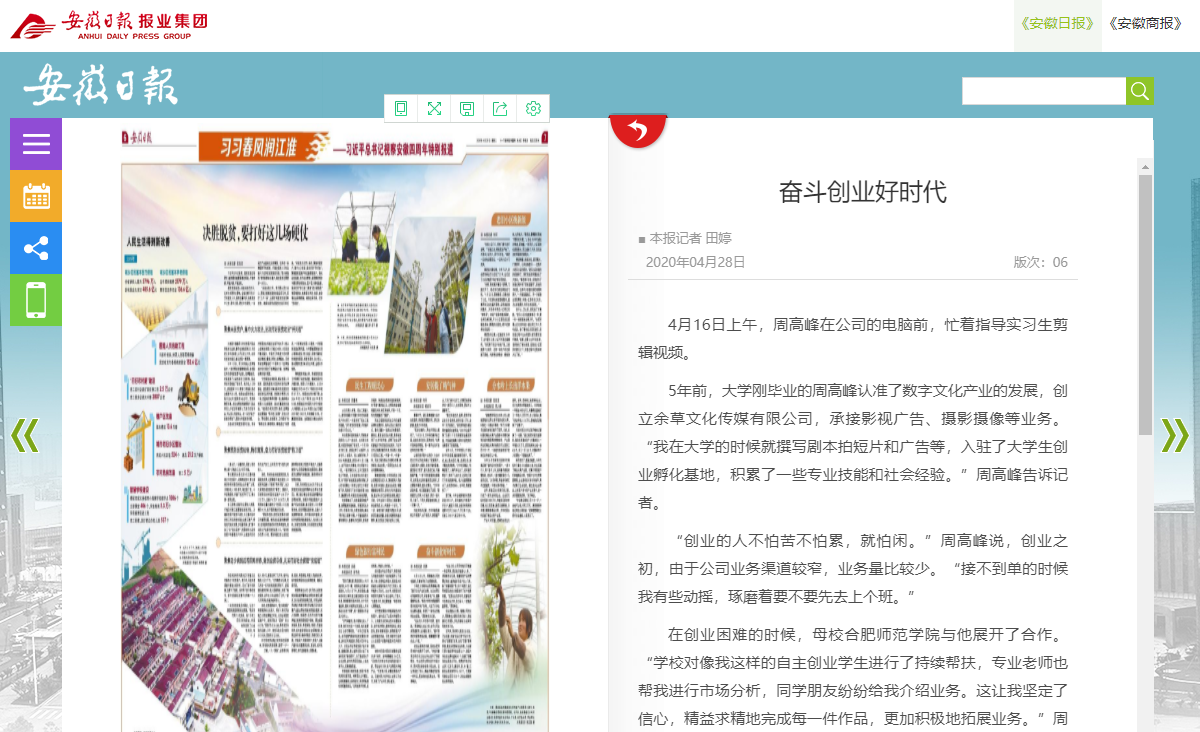 本网讯 4月28日,《安徽日报》第06版以《奋斗创业好时代》为题报道了我院文学院编辑出版学专业2015届毕业生周高峰的创业经历。周高峰在接受记者采访时表示,“在创业困难的时候,母校beat365中文官方网站与他展开了合作。学校对像我这样的自主创业学生进行了持续帮扶,专业老师也帮我进行市场分析,同学朋友纷纷给我介绍业务。这让我坚定了信心,精益求精地完成每一件作品,更加积极地拓展业务。”