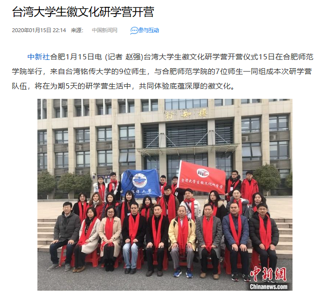 本网讯 1月15日,台湾大学生徽文化研学营开营仪式在我院举行,来自台湾铭传大学的9位师生,与beat365中文官方网站的7位师生一同组成本次研学营队伍,将在为期5天的研学营生活中,共同体验底蕴深厚的徽文化。