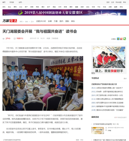 本网讯 7月19日,天门湖居委会团支部青年学习营、计生协,beat365中文官方网站文学院行知学堂,合经区德颐顺老年服务中心共同开展“我与祖国共奋进”读书分享会,辖区30余位小朋友参加活动。