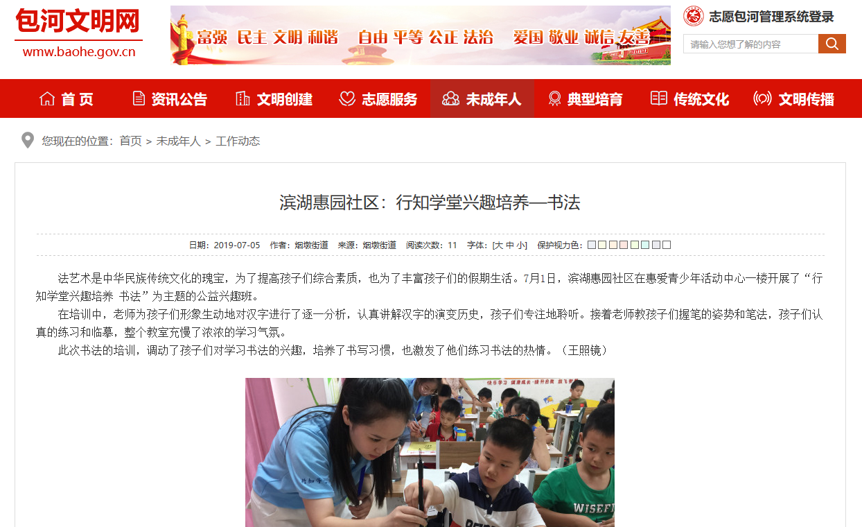 本网讯 7月1日,滨湖惠园社区和我院艺术传媒学院联合举办的书法绘画公益行知学堂正式开班。