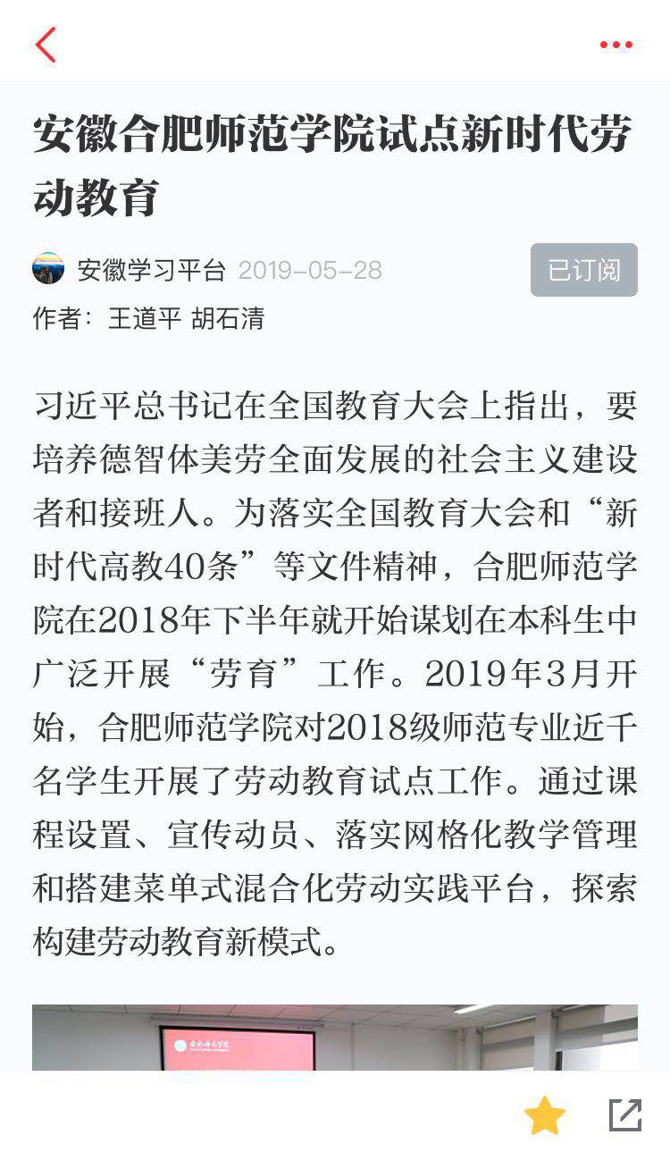 本网讯 5月28日,中共中央宣传部“学习强国”平台以《安徽beat365中文官方网站试点新时代劳动教育》为题,在“创新安徽”栏目转载了我院探索开展师范生劳动教育新闻,再度引发社会各界的广泛点赞和转发。