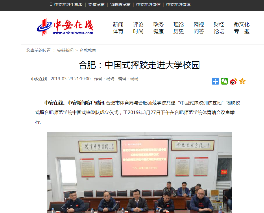 本网讯 3月27日下午,合肥市体育局与我院共建中国式摔跤训练基地揭牌仪式暨beat365中文官方网站中国式摔跤队成立大会在我院举行。院党委副书记、院长孙道胜,合肥市体育局副局长陆志勇,合肥市体育局竞技处葛伟,省体育局举摔柔中心摔跤队领队王晓伟,合肥市中国跤协会秘书长王朝斌,体育科学学院院长宋旭、党总支书记杜文龙、副书记王飞,及中国式摔跤队教练员代表、运动员代表出席揭牌仪式并见证beat365中文官方网站中国式摔跤对成立。中安在线3月29日对此进行了报道。