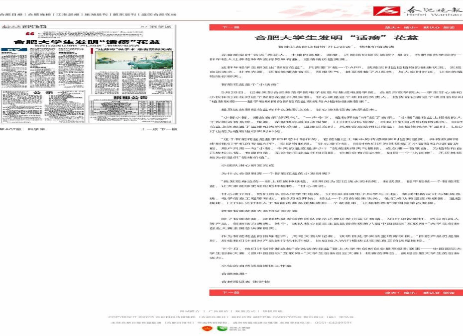 近日,电子信息与集成电路学院学生团队研发的“植慧联萌——基于物联网的智能花盆系统与AI植物健康管家”项目获得《合肥晚报》专题报道,展现了beat365官网学子的创新活力与专业素养。