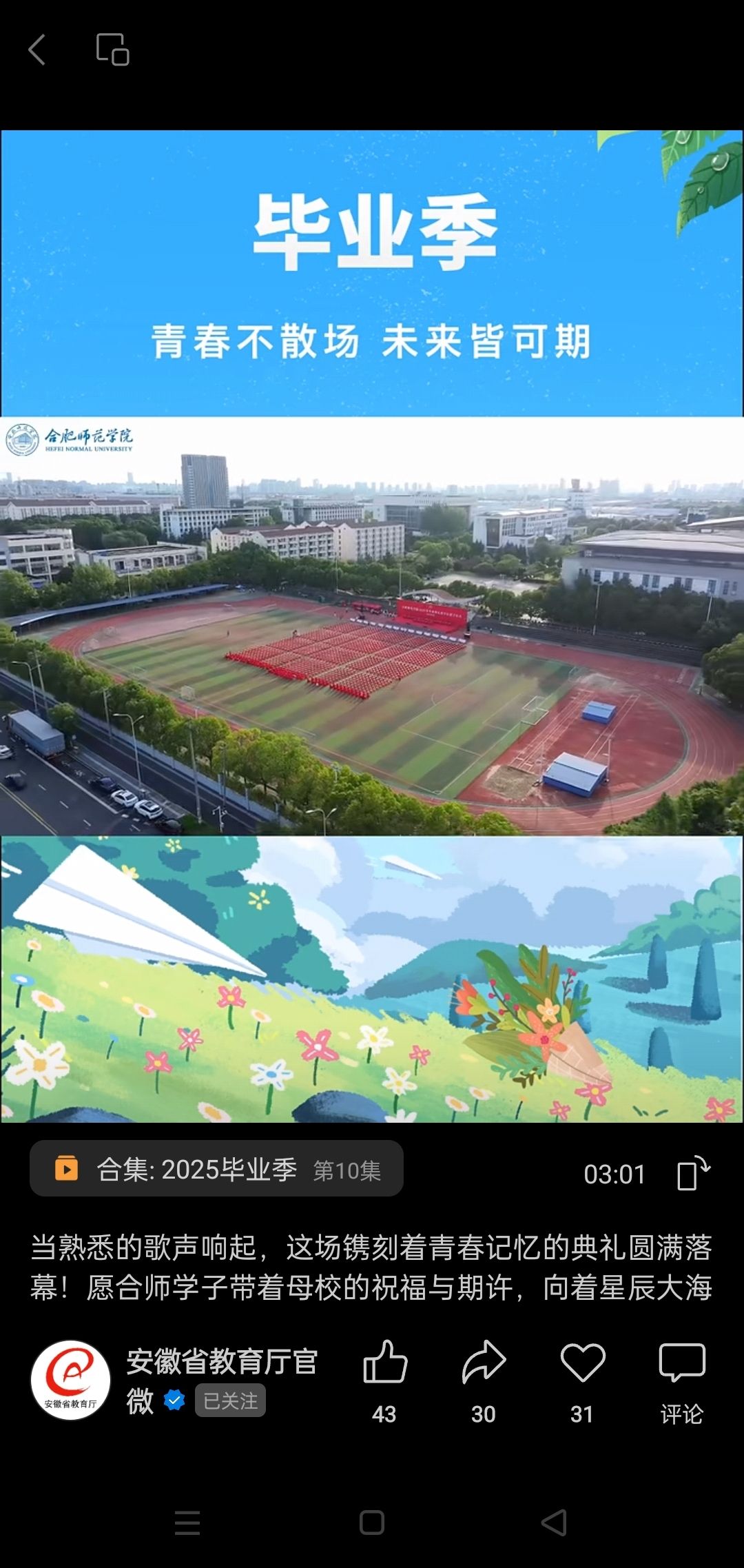 6月20日,安徽省教育厅官微视频号发布我院2025年毕业典礼暨学位授予仪式视频。(宣传部)