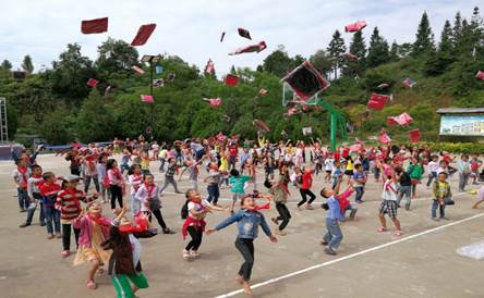(从江县谷坪乡银潭小学的学生们兴高采烈领取新文具)